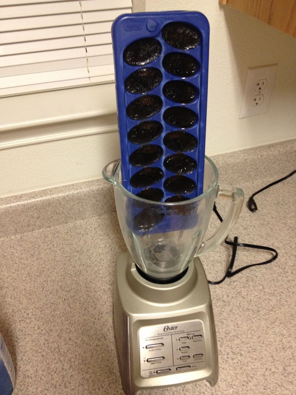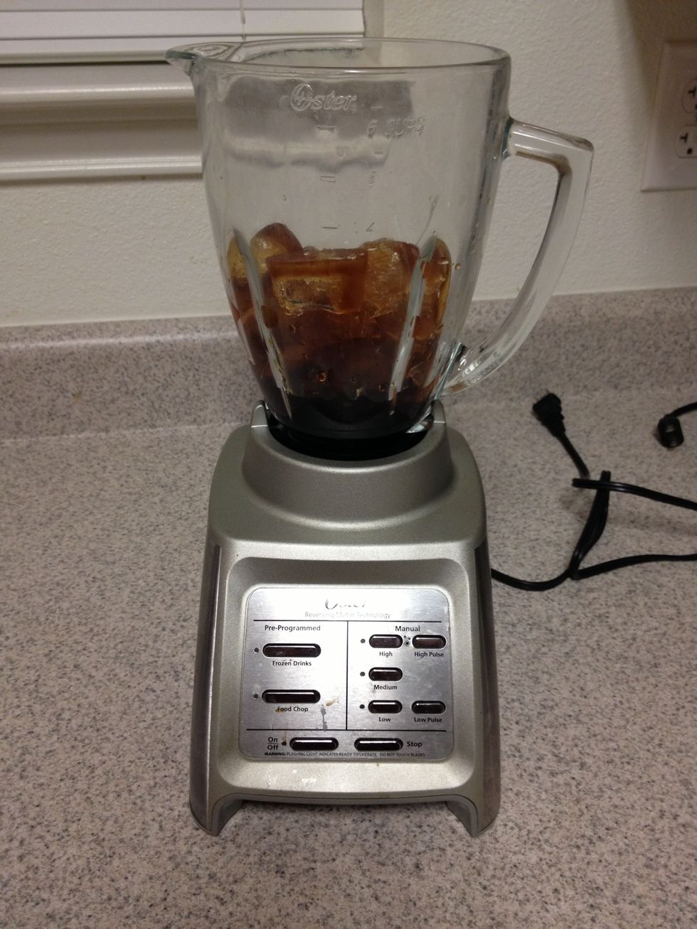 Empty ice tray into blender, pre-brewed coffee.