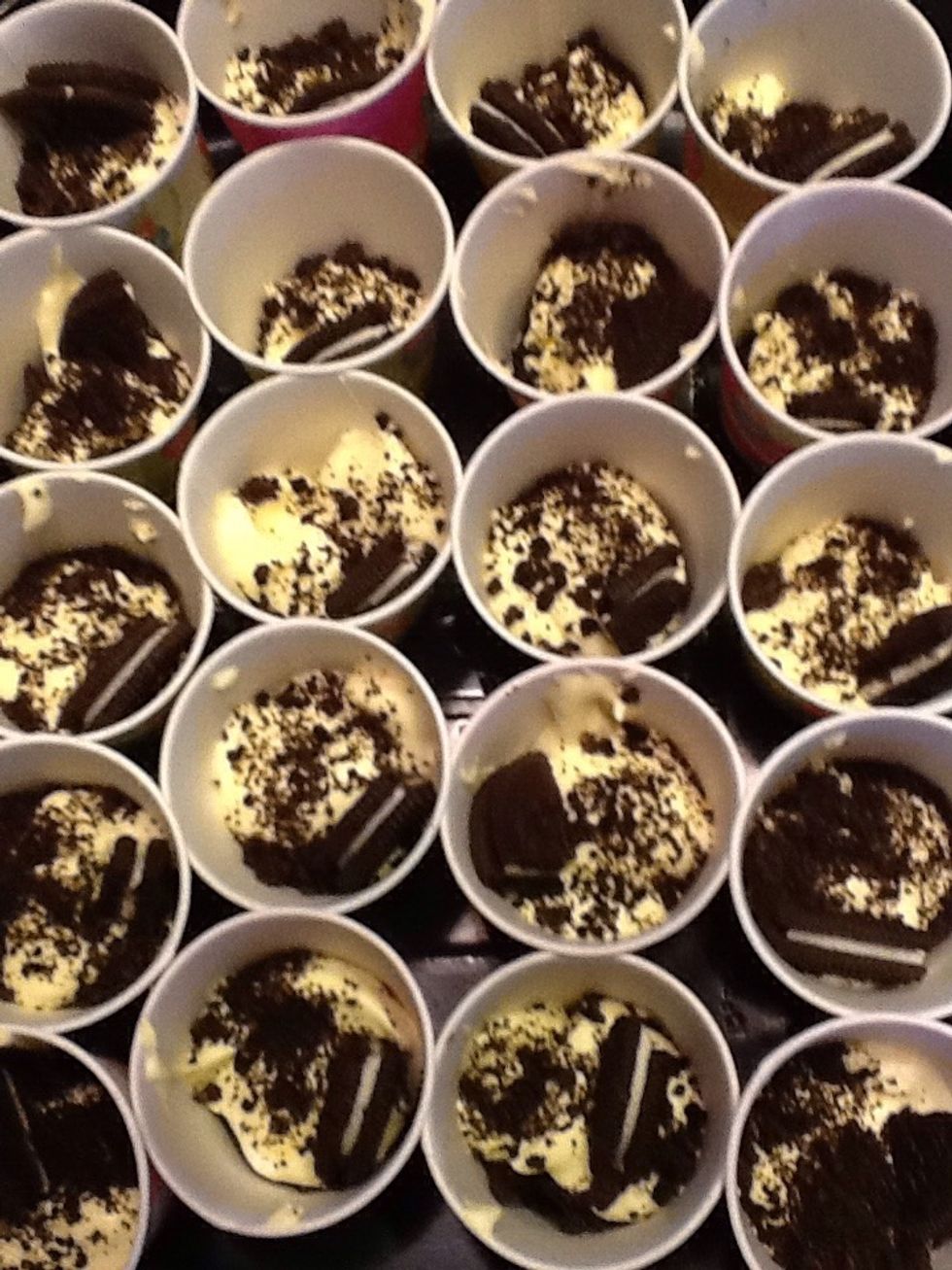 Put a layer of crushed Oreos bottom of Dixie cup🙈