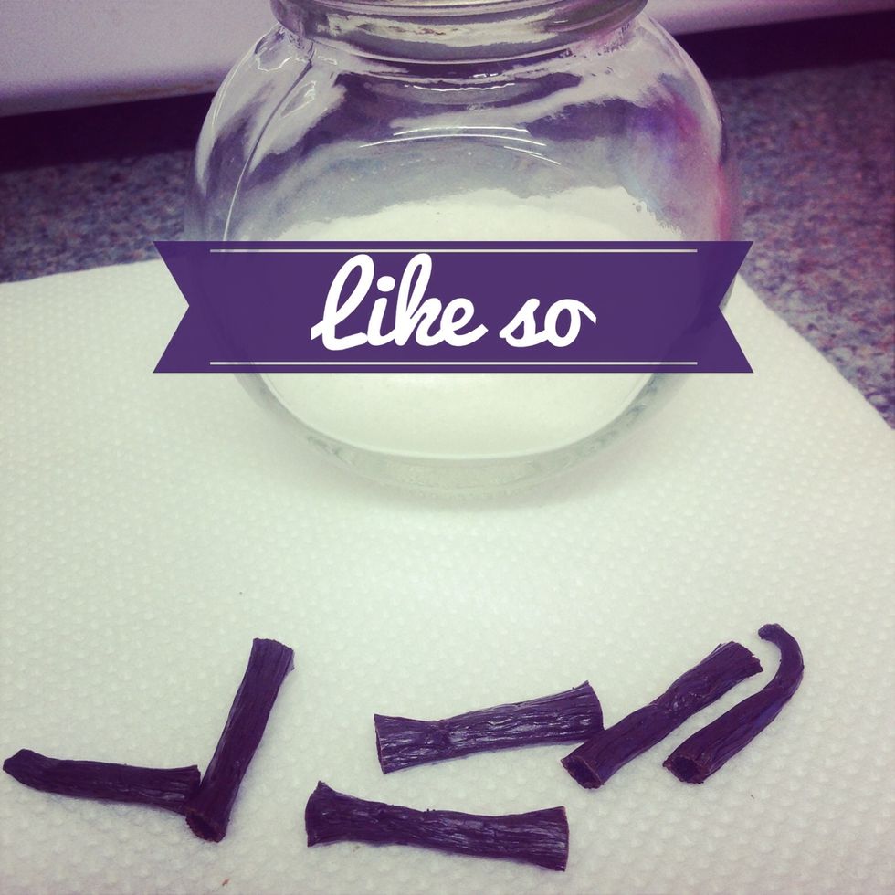 Cut the vanilla pod into smaller bits and layer onto the sugar.