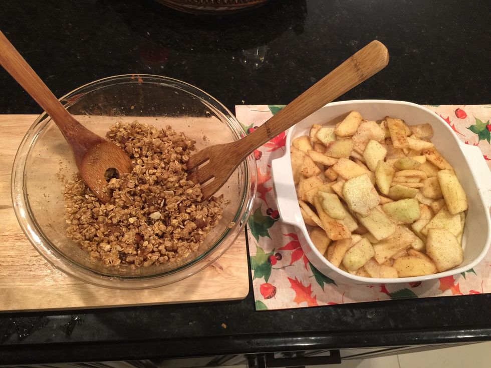 Season apple slices with cinnamon sugar and drizzle with agave nectar. Then assemble in casserole dish.
