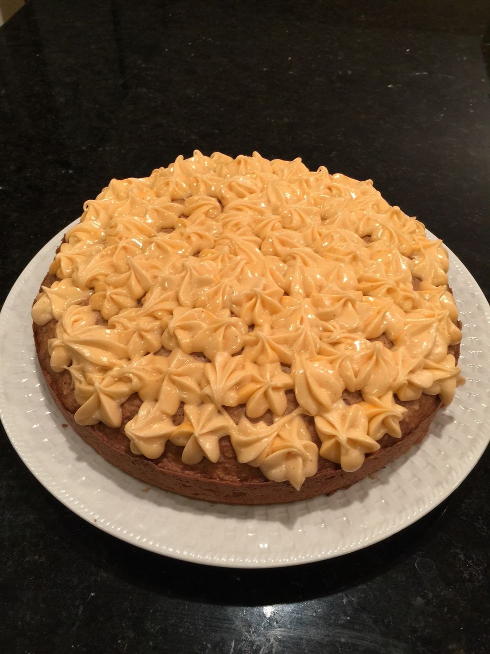 When cake is completely cool release it from springform pan by unlocking the latch. Then place one hand on top layer of cake and gently flip over and peel away parchment paper then place down on dish.