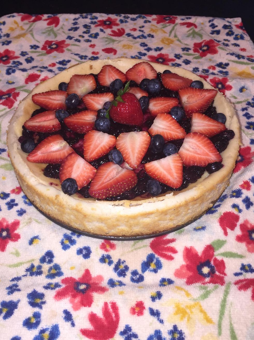 Then add fresh strawberries and blueberries. Then release the springform pan latch to take out cheesecake.