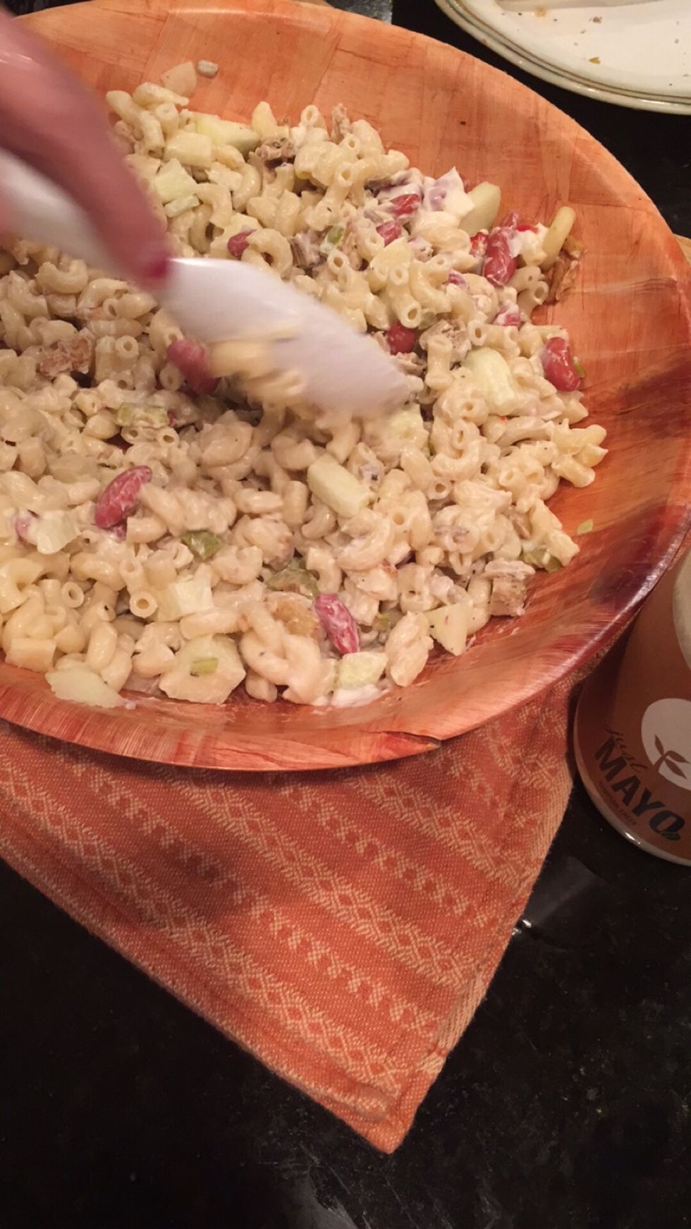 Add apples, minced red onion and sunflower seeds to macaroni.