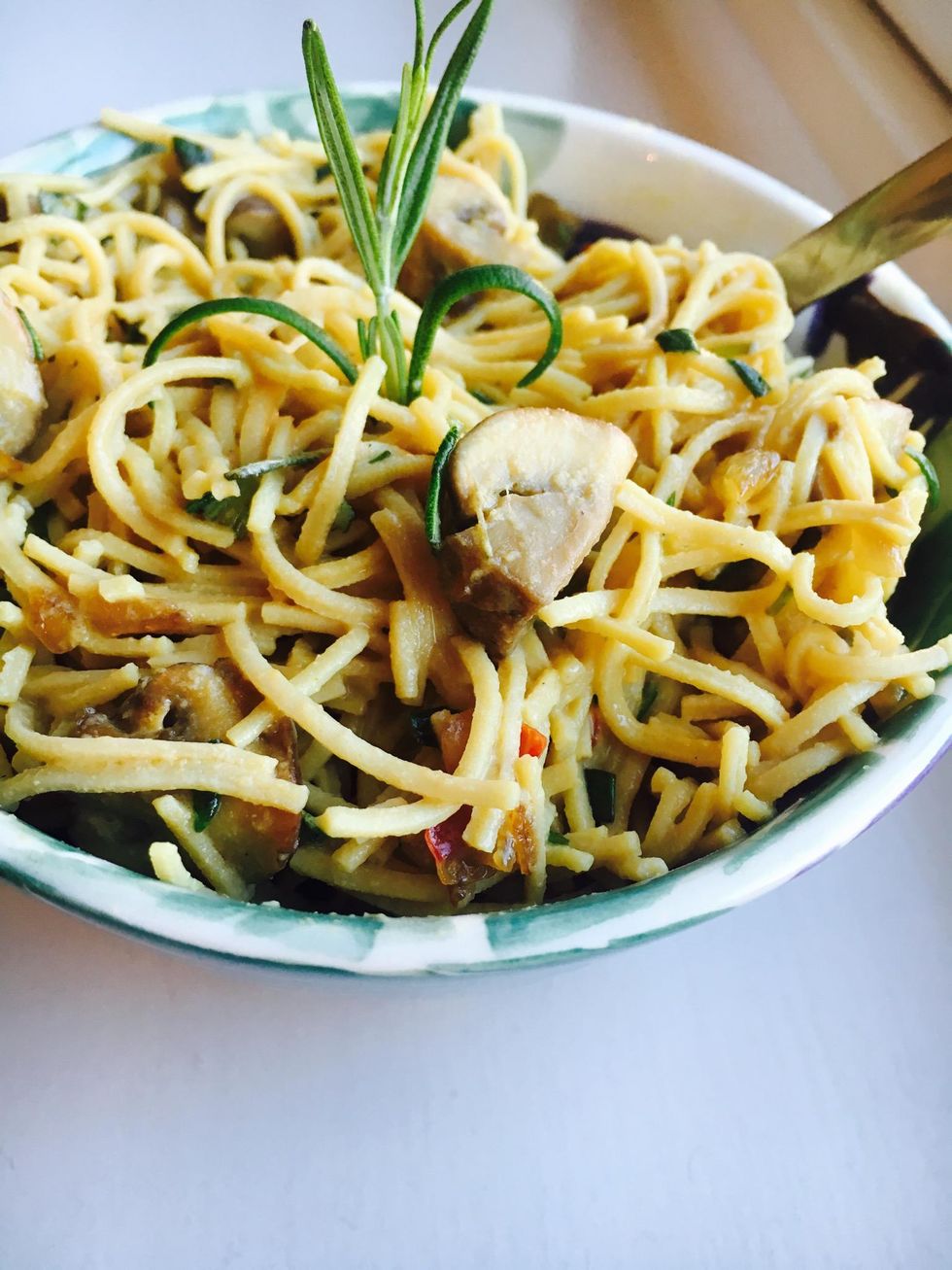 Ingredients: white bean spaghetti/zoodles, olive oil, cremini mushrooms, salt, pepper, red chili, small yellow onion, nutritional yeast powder, almond/soy/or other non-dairy milk