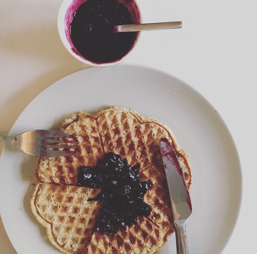 Serve waffles with blueberry jam on top. Enjoy 😋