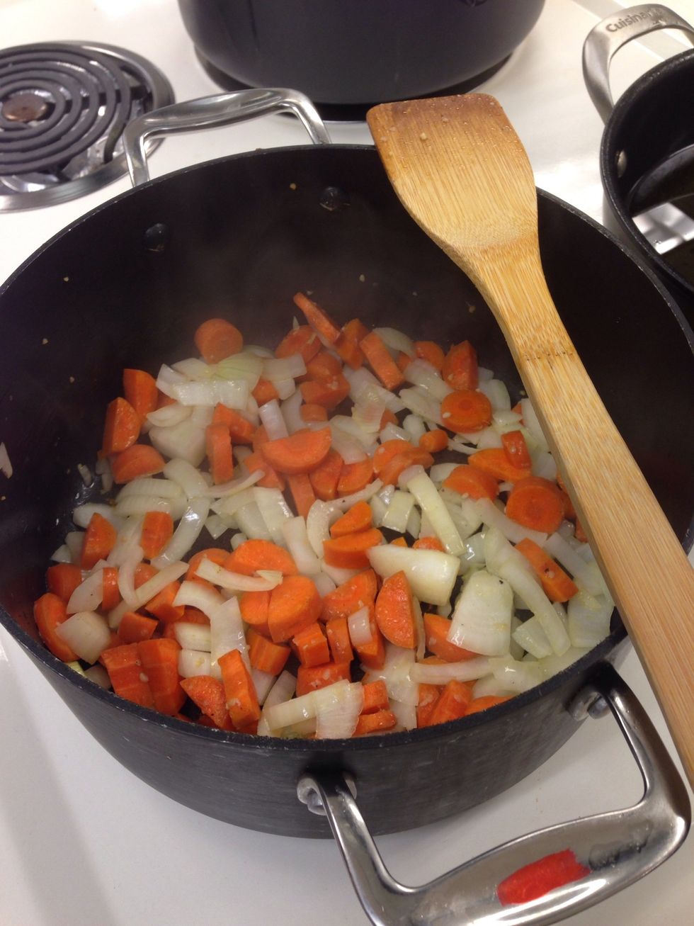 In the stock pot heat oil over medium heat cook onion, garlic and carrots stirring occasionally for 5 minutes