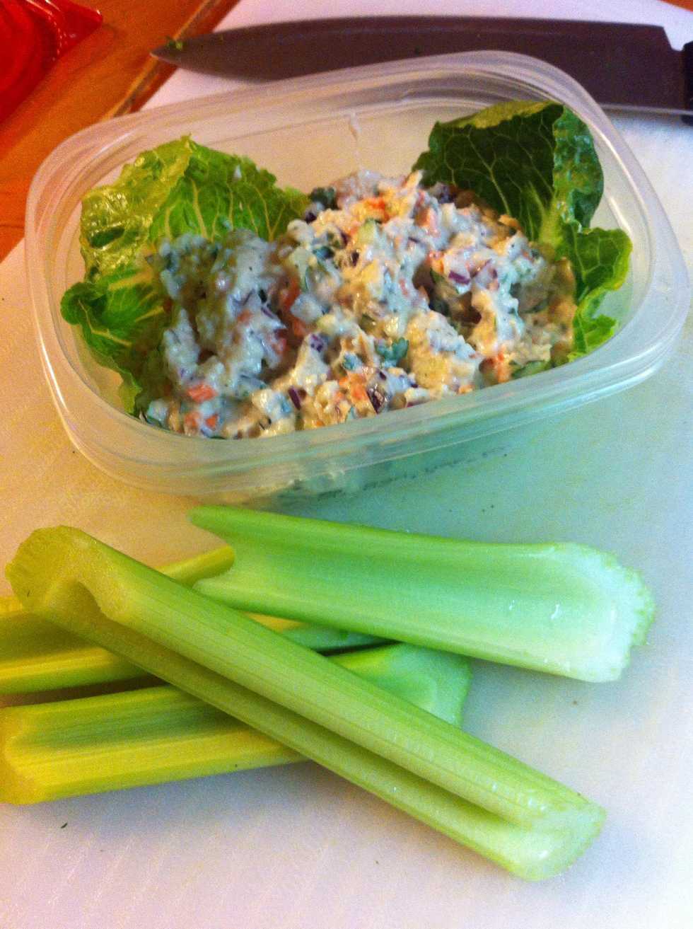 1.0 Can Tuna Cucumber Carrot Red onion Mayo Cilantro Salt & Pepper Parmesan cheese Parsley Lettuce leaf Celery Chopped Garlic