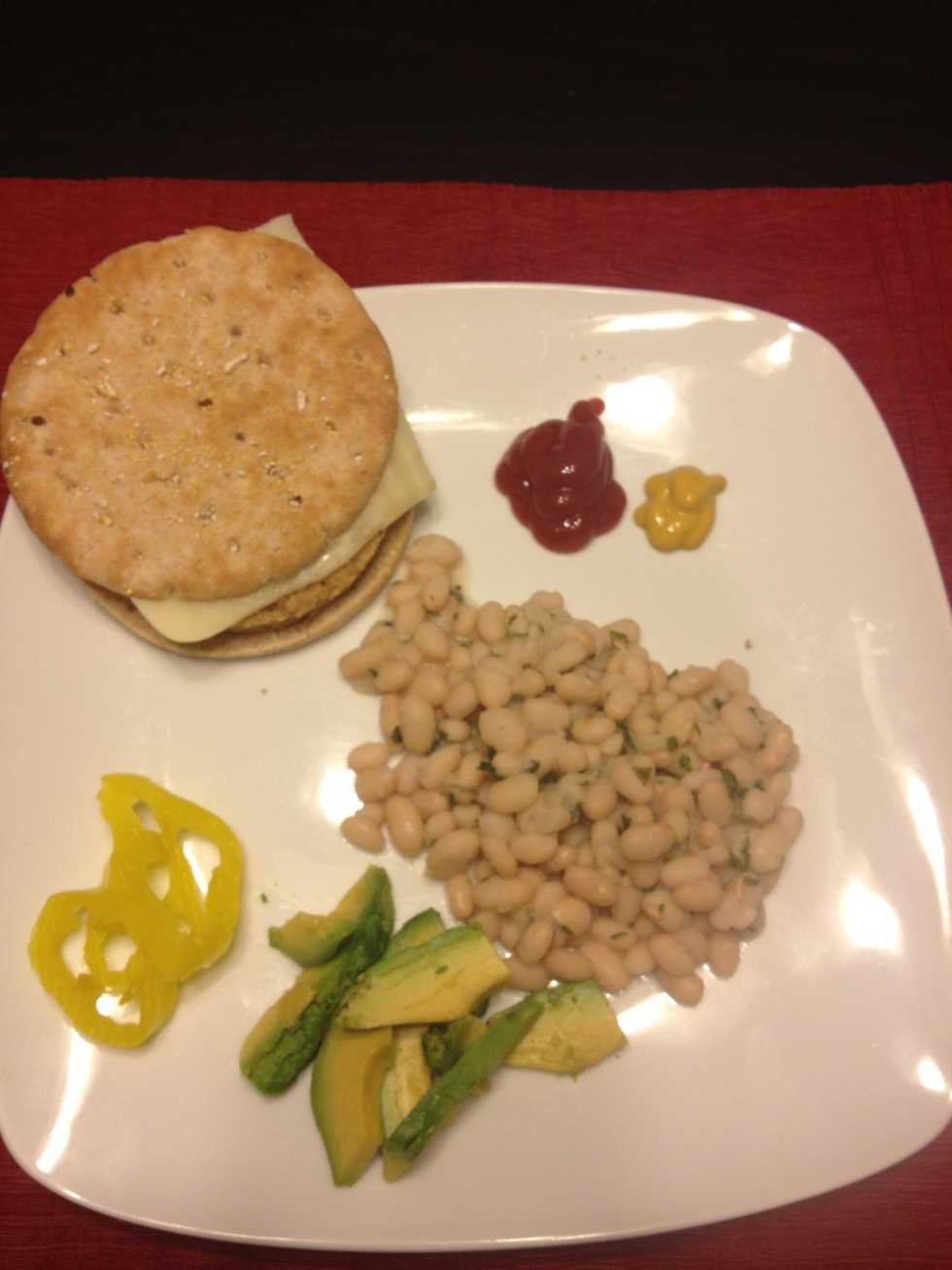 Total cals: 1/2 cup navy beans 80 1/4 avocado 62 Bread round 100 Veggie burger 70 Mozzarella cheese slice 70 1/8 cup mild pepper rings 5 Mustard 0 1/2 T ketchup 10 Total= 397 calories