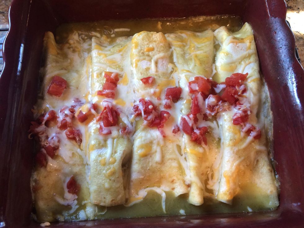 Mix veggies and cheese in bowl. Put mixed veggies in tortilla and roll them up. Put the open side down and put tomatoes and cheese on top. Pour sauce over and bake. 350 for about 20 mins. Enjoy