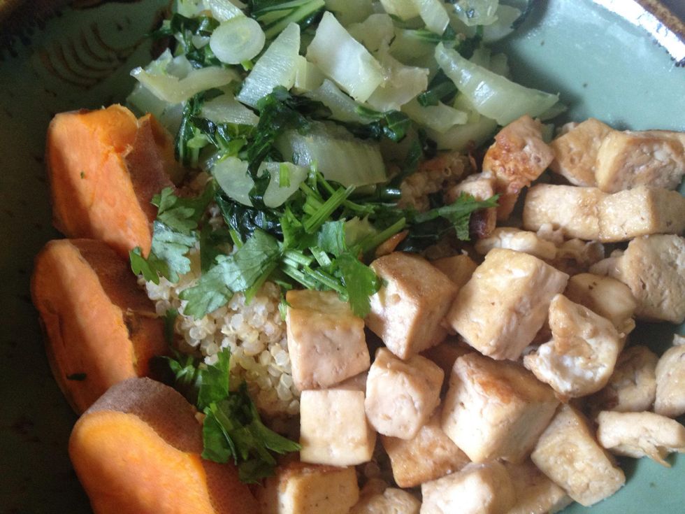 Cook quinoa using 1:2 ratio ( quinoa: water/stock). Mix in some tahini sauce for flavoring. Add a tea spoon of salt.