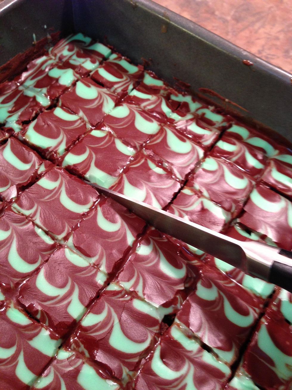 Sprinkle chopped Andes Mints over batter. (You can now buy them already chopped) Bake 350° for 27 minutes. Cool pan on wire rack.