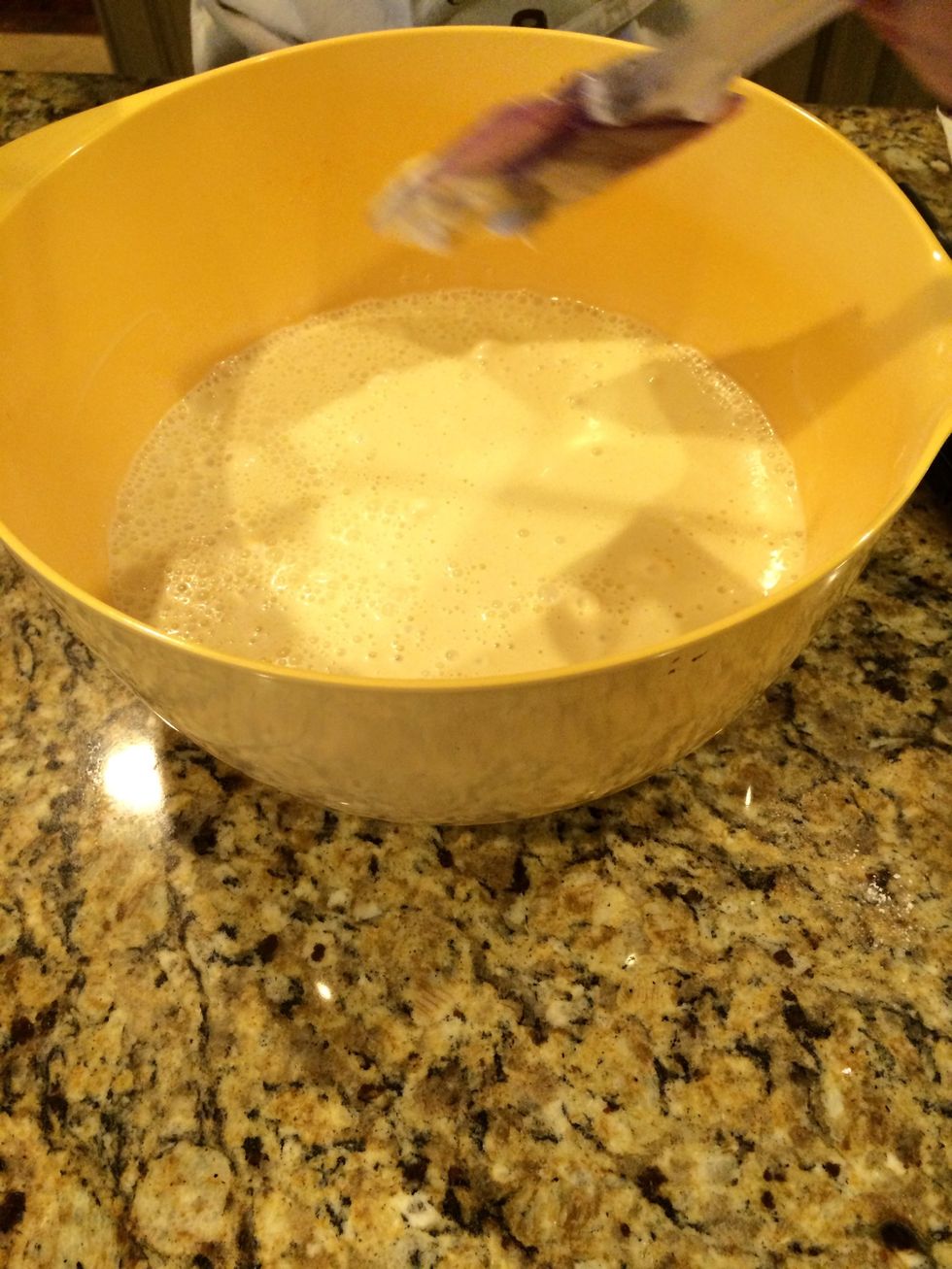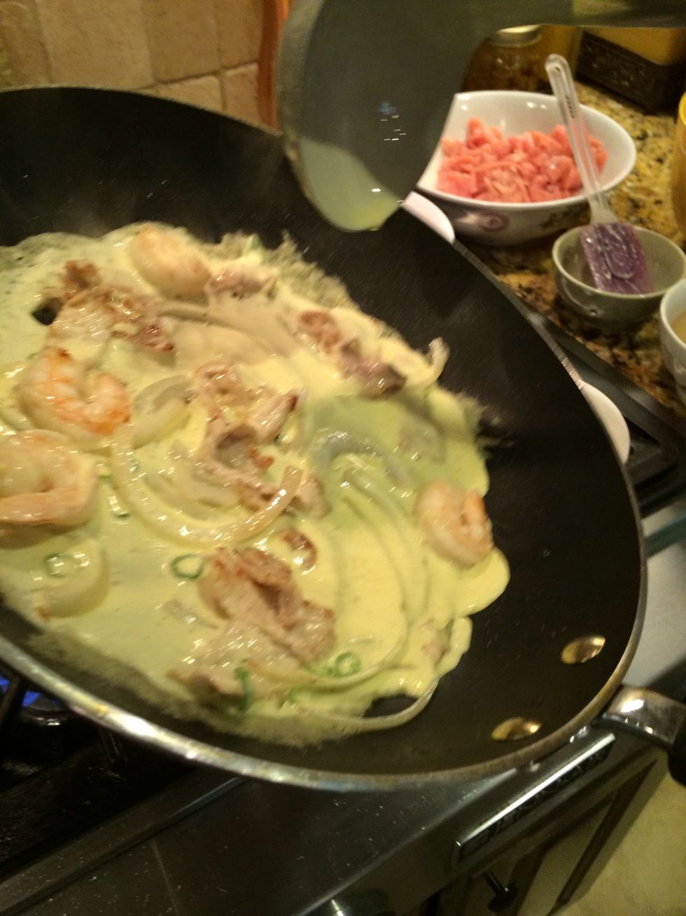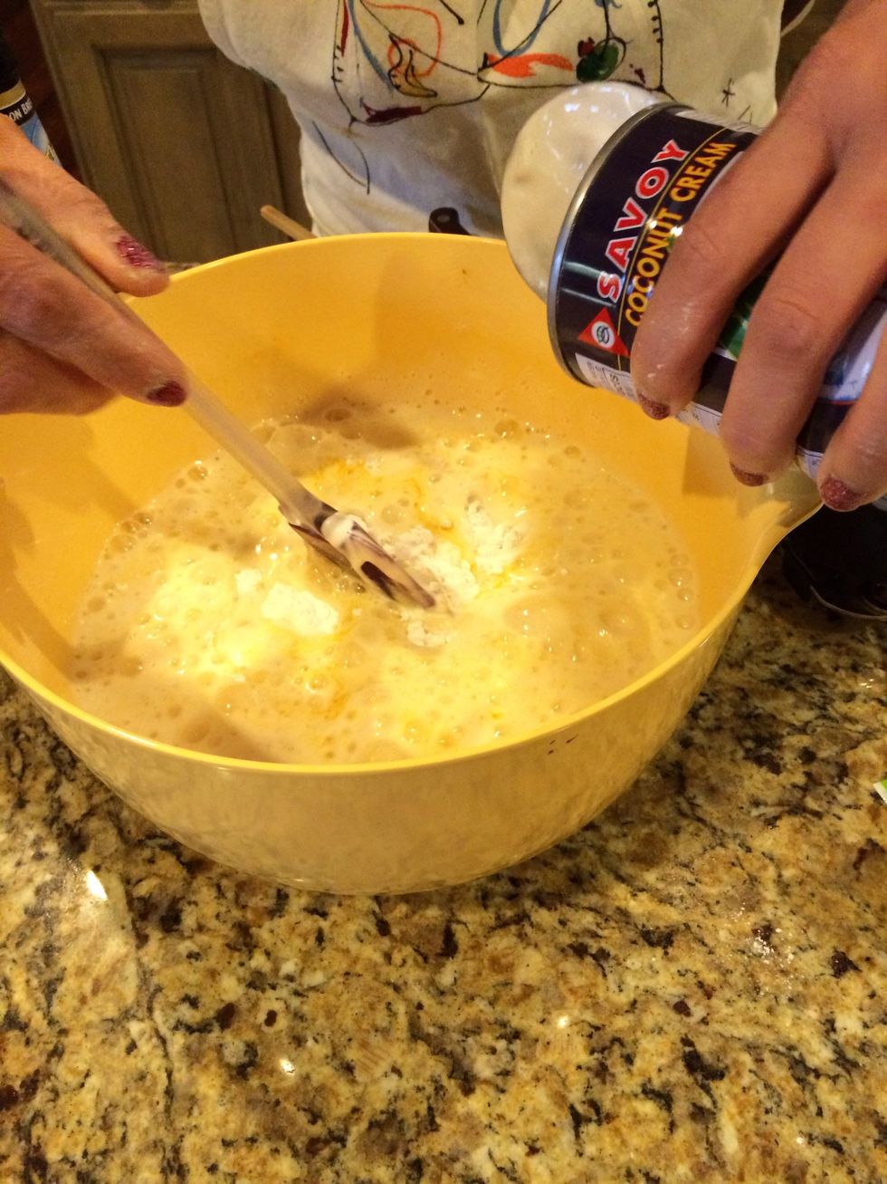 Add 1 can of coconut milk to 1 bottle of beer to 1 1/2 cups water to mix.