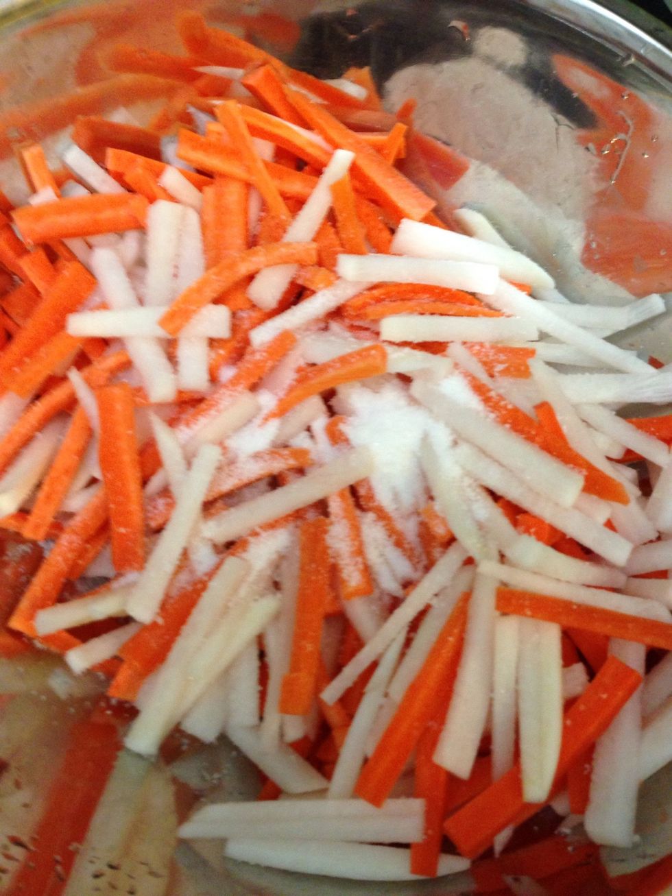 Place the carrots and daikon radishes in a large bowl. Sprinkle with 4 teaspoons of sugar and 2 teaspoons of salt. Use your clean hands to toss the carrots and daikon until it well coated.