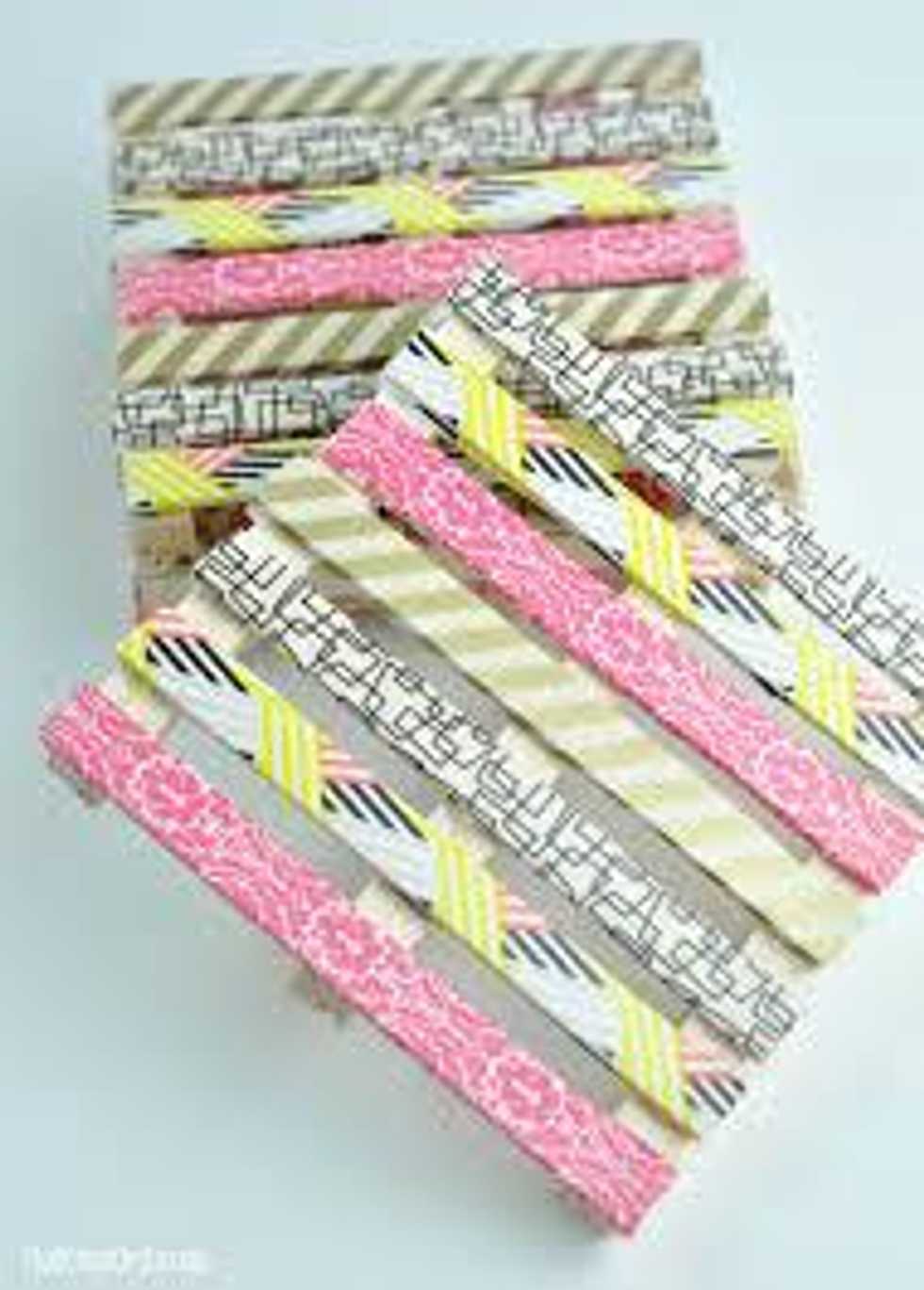 Using four washi tape patterns you can pick one favorite. The washi tape is just the right width to cover the craft sticks. Using scissors,cut the ends off the tape. Finish by pushing down the tape.