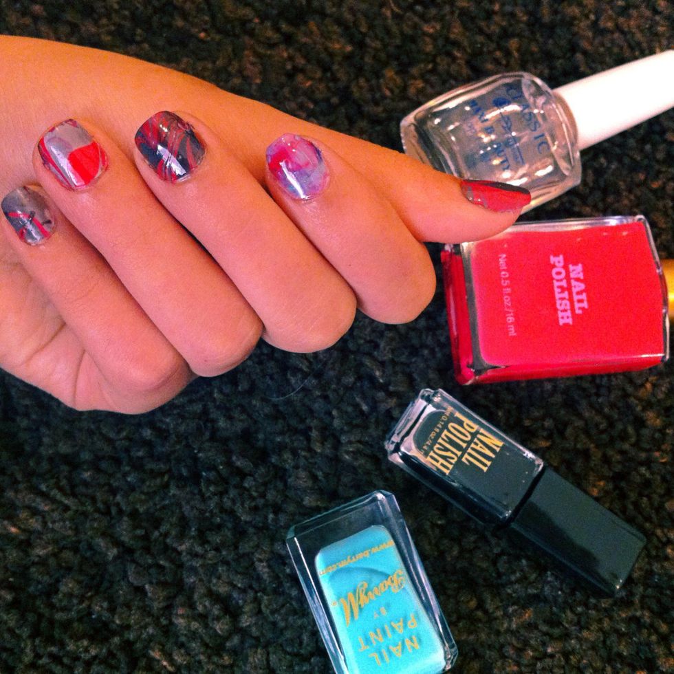 Carefully apply a drop of each of the nail varnishes to the water.