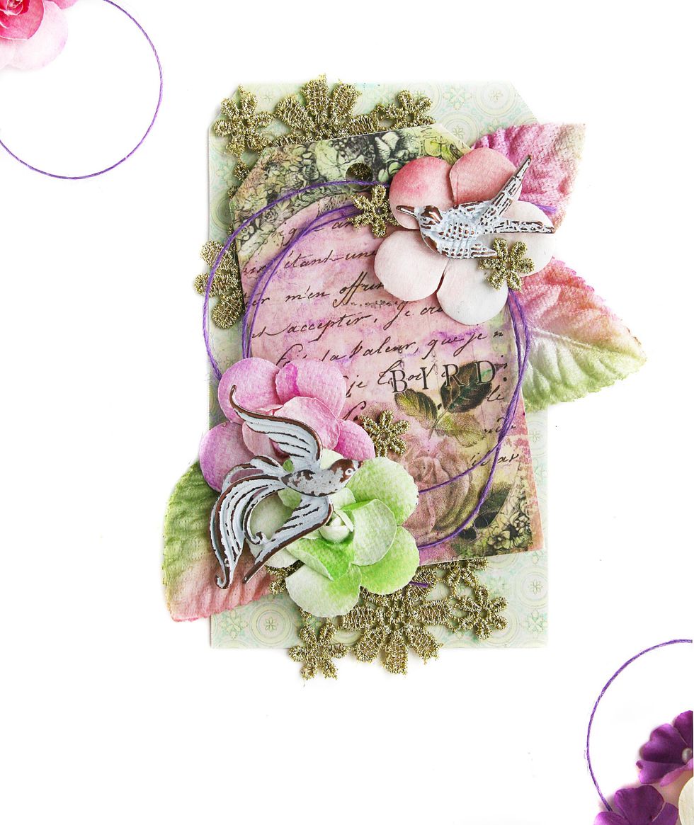 Pull rose apart, removing the center. Add to top right of tag. Add two Metal Bird Trinkets with adhesive as shown. Tuck in 3 or 4 small gold flowers cut from trim.
