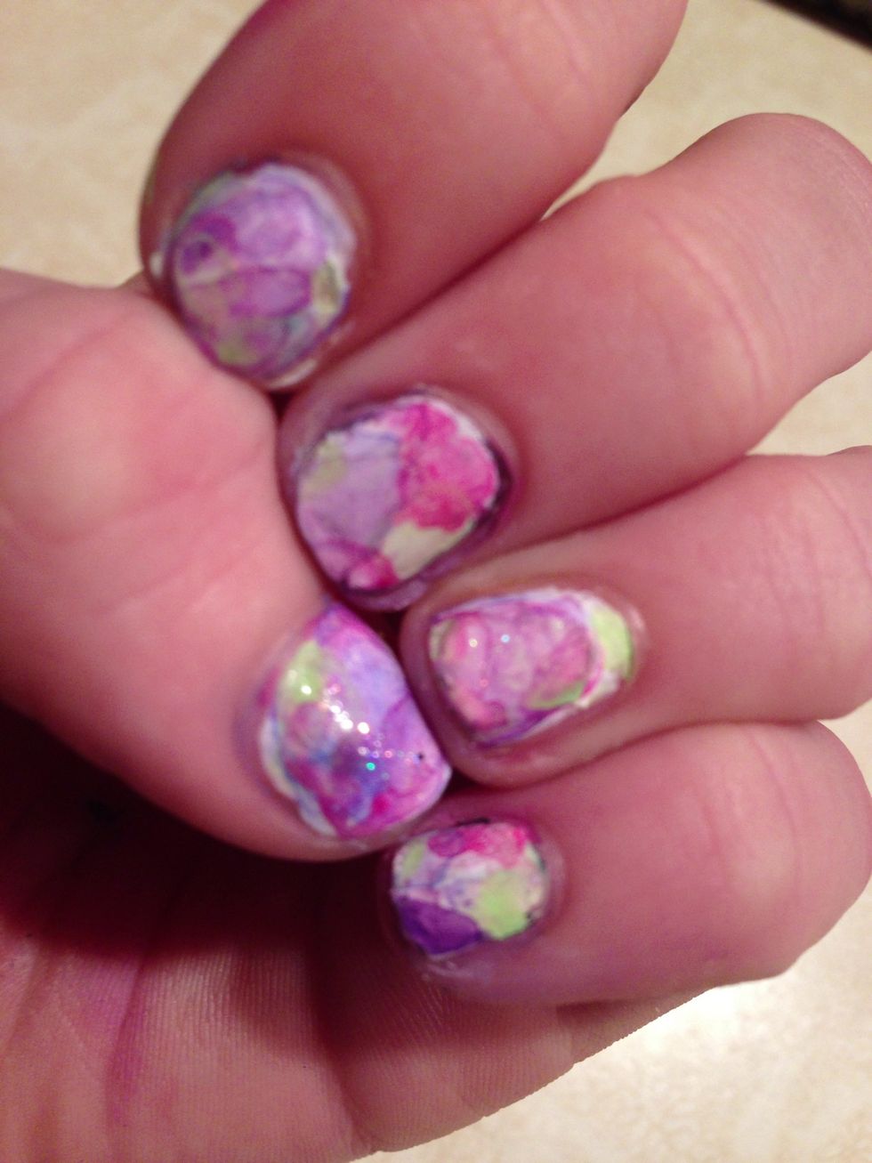 Combine water and acrylic paint until the mixture is still a liquid but colored completely. Make sure there is no lumps of paint. Now just think of your nails as a canvas and paint!