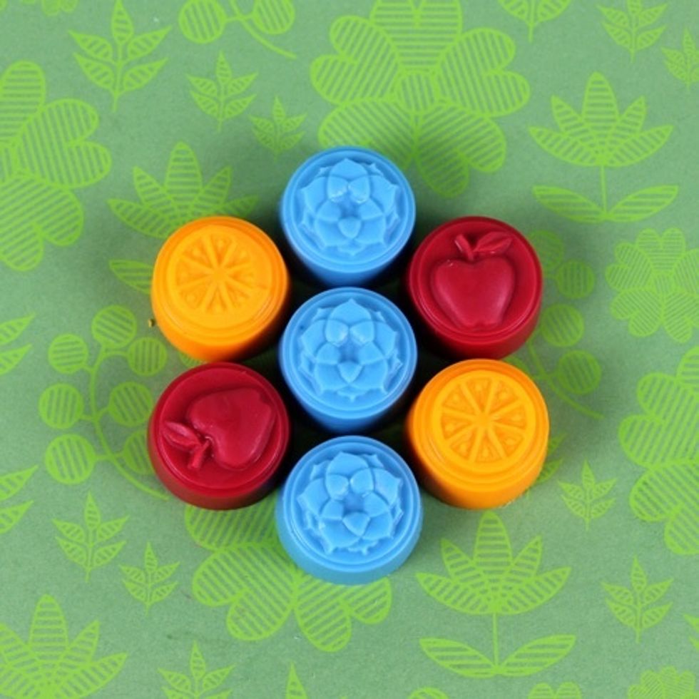 Now carefully pour one container of wax per mold. I put the blue wax in the Lotus Blossom mold, the orange wax in the Citrus mold and the red wax in the Apple mold.