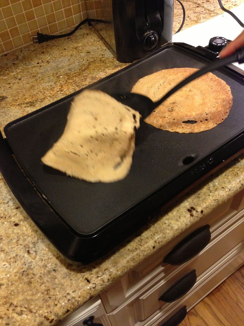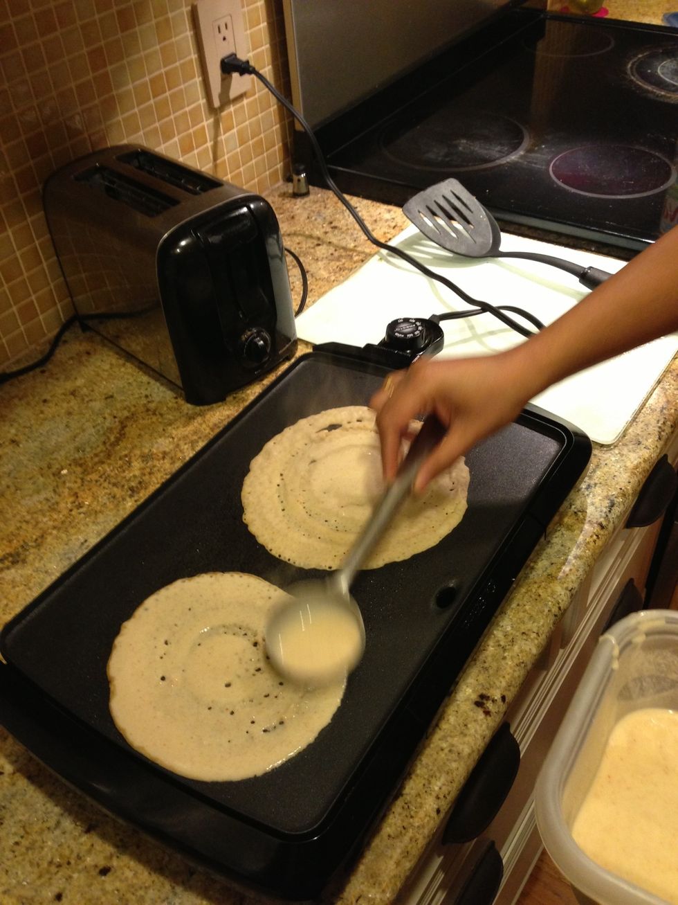 Pour batter onto the griddle using a ladle. Immediately use the back of ladle and spread the batter in circular motion from the center towards the end making the batter spread thinner.