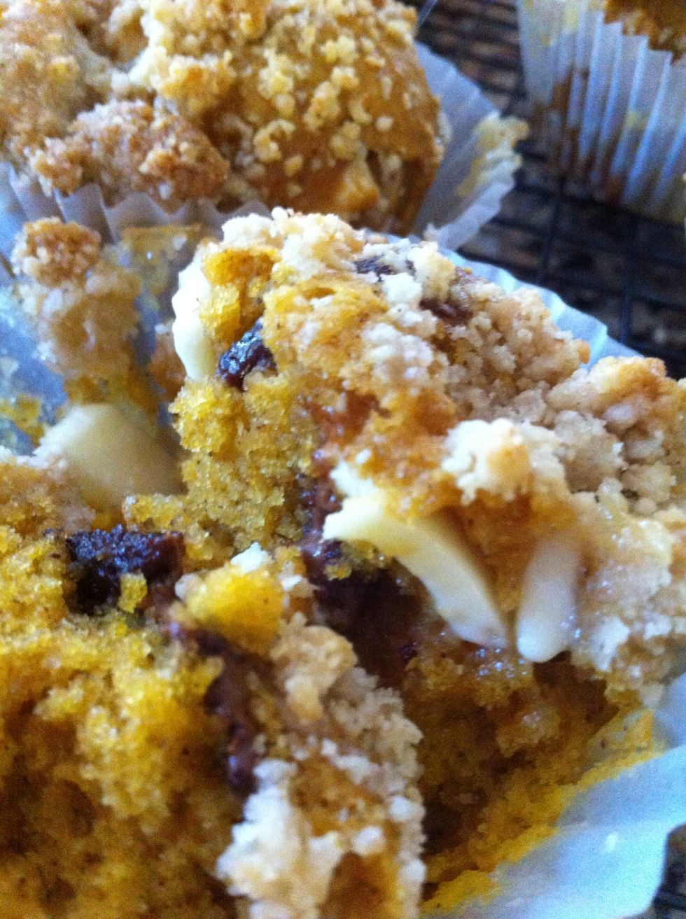 Scoop out 24 muffins. I also make a strudel topping: in the food processor blend 3/4 cup cold butter, 1Tb cinnamon, 2cups flour, 1 cup brown sugar and 1 cups oats
