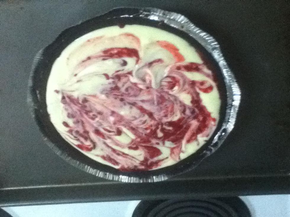Pour rest of batter on top then add 3 more drops of raspberry sauce.