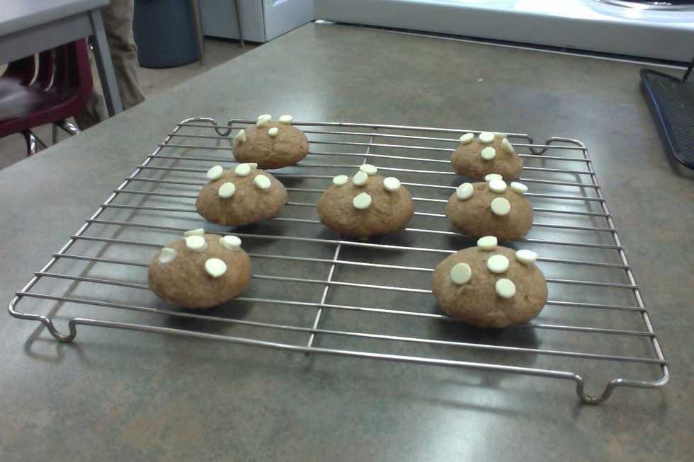 Take the cookies out of the oven and put white chocolate chips in them.