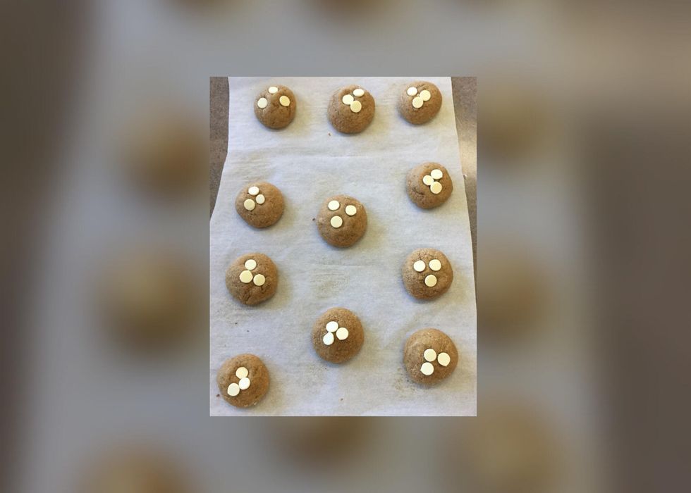 9. Immediately press a couple of white chocolate chips into center of each cookie.