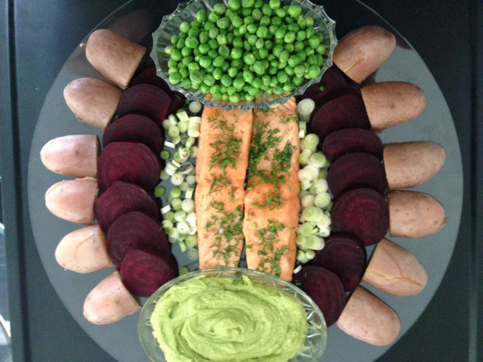 Another presentation . Flake salmon mix with avocado, mayonnaise, sweet peas put them in the middle of a flat serving dish and put potatoes and beet roots around garnish with the herbs and scalions