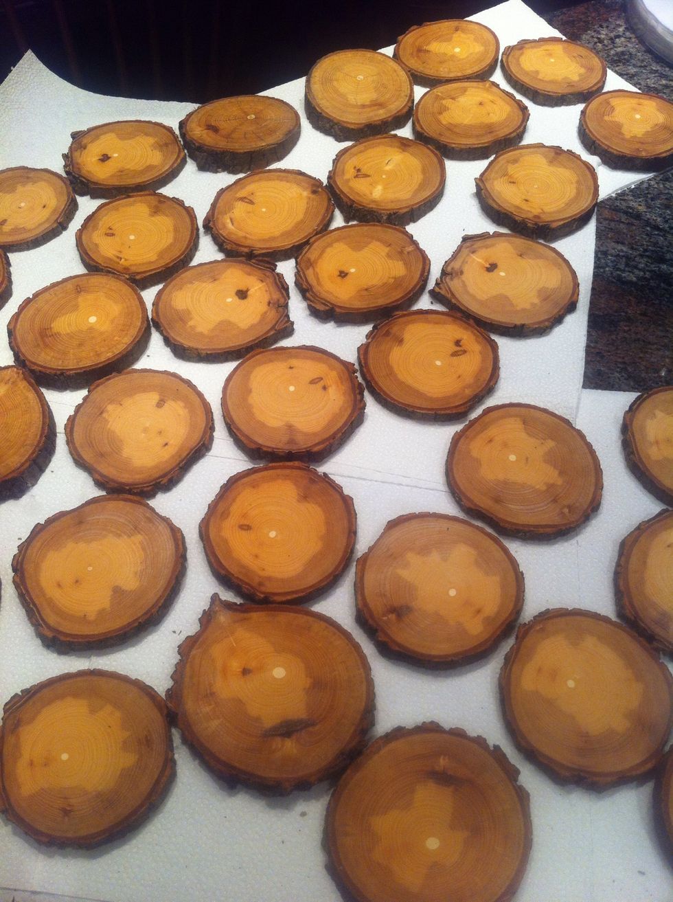 Stain the coasters with Vegtable oil on a j cloth. The ones on the top of the picture are stained.