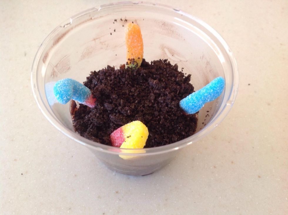 Gather your ingredients: pudding cup(s), Oreos, and gummy worms. For one "Worms in Dirt" you need 1 pudding cup, 5 Oreos, and 4 gummy worms.