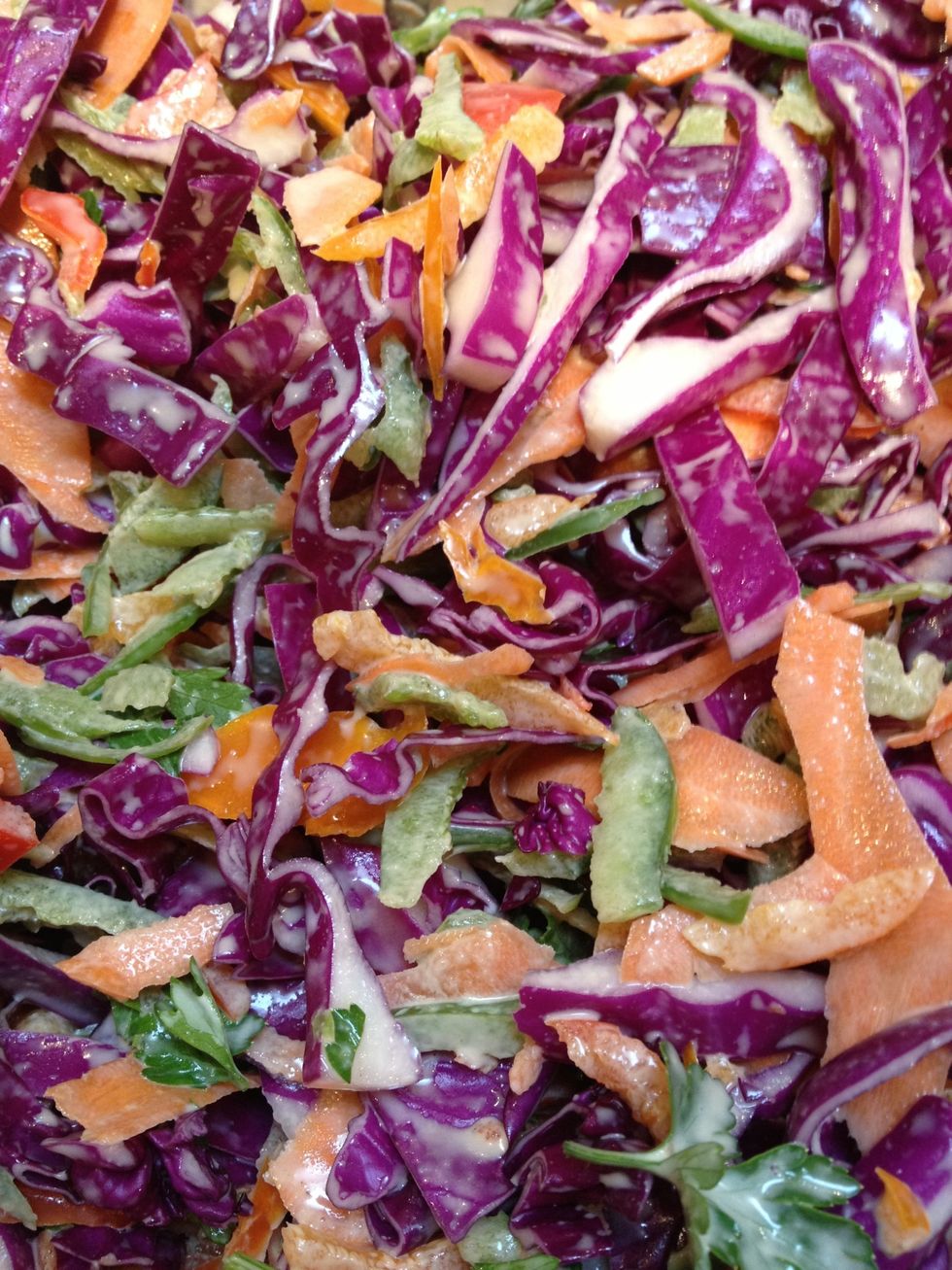 Stir well, so that all the cabbage, carrots and peppers are evenly coated in dressing.