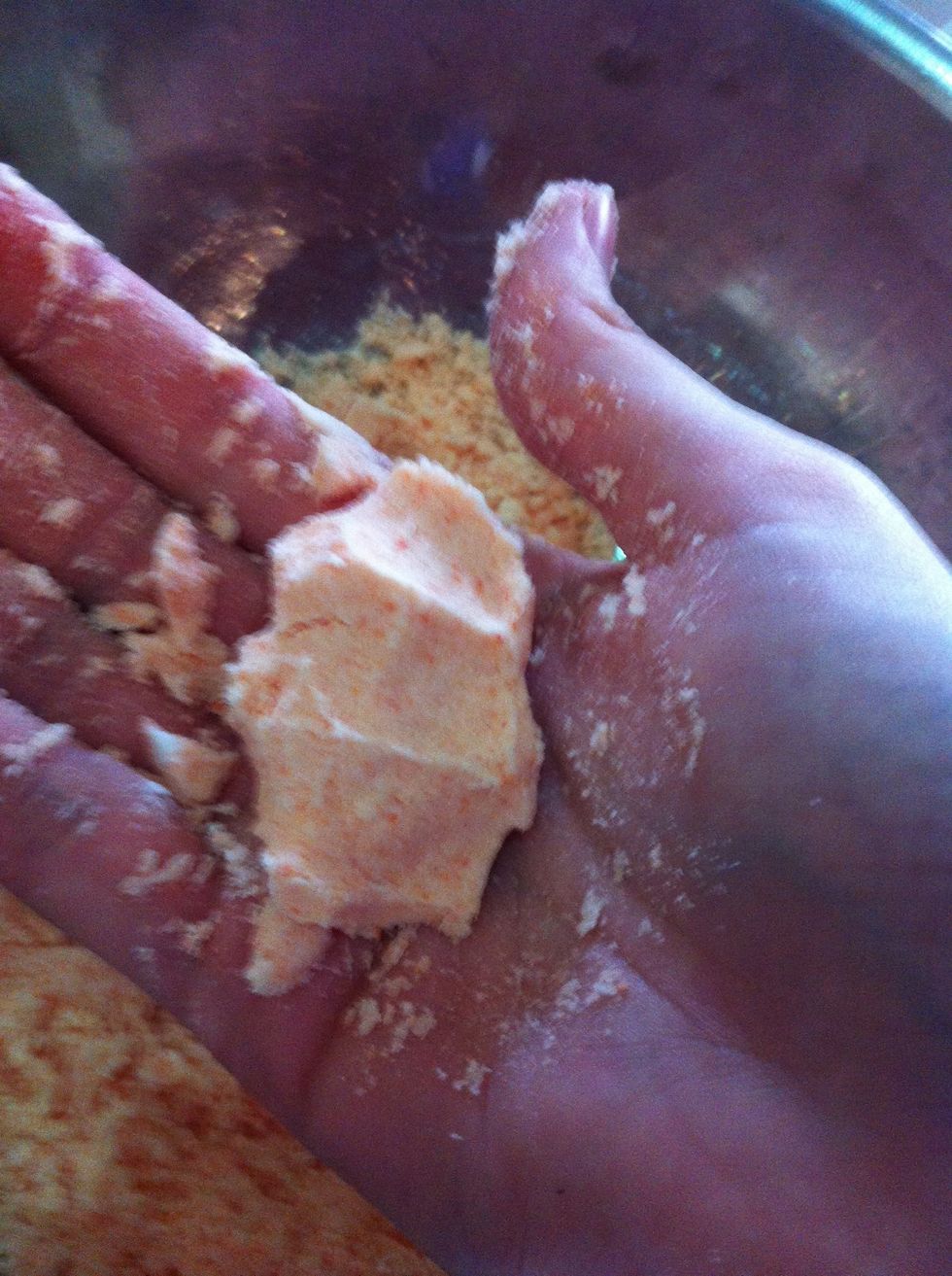 Place half a cup of the base mixture into the other bowl. (You can use the rest to create different scented bath bombs).