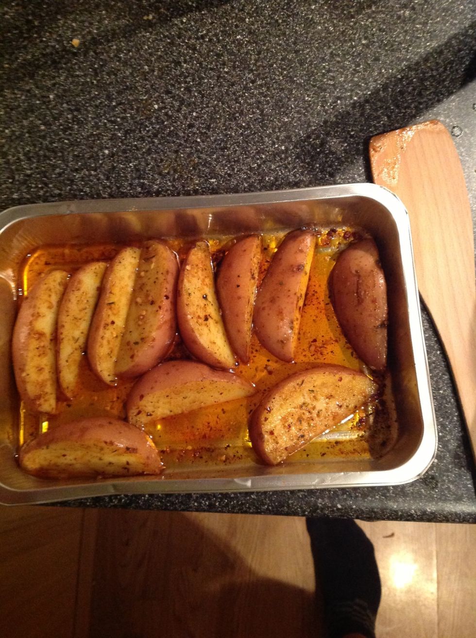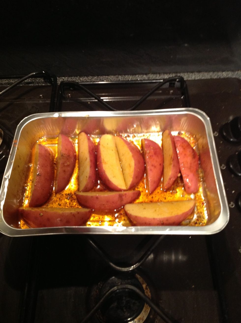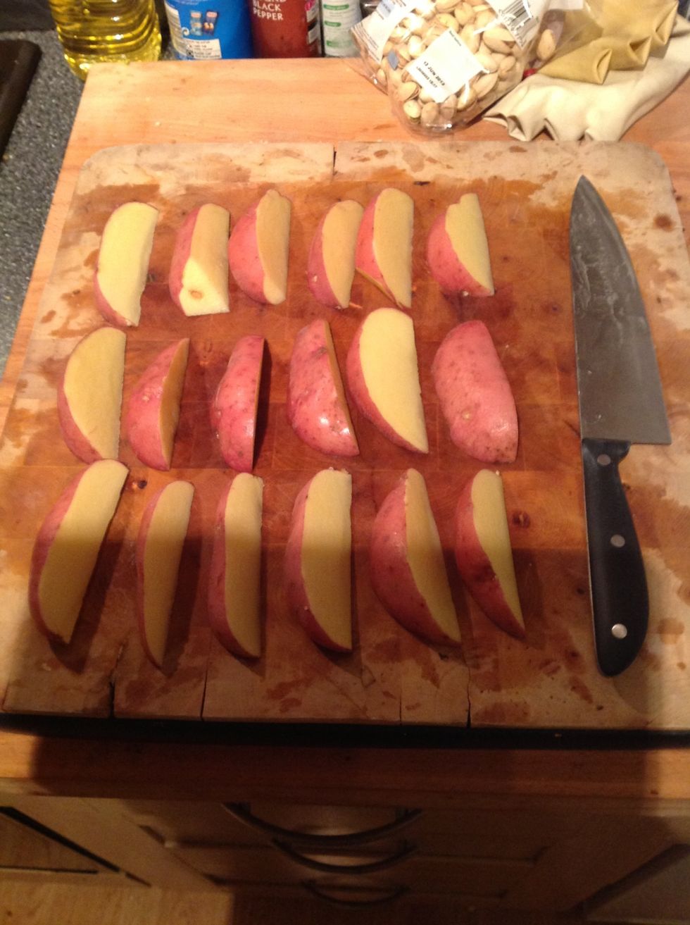 Turn the oven on to 180 C / 350 Fahrenheit. Wash your potatoes. Cut your potatoes, leaving the skins on into segments