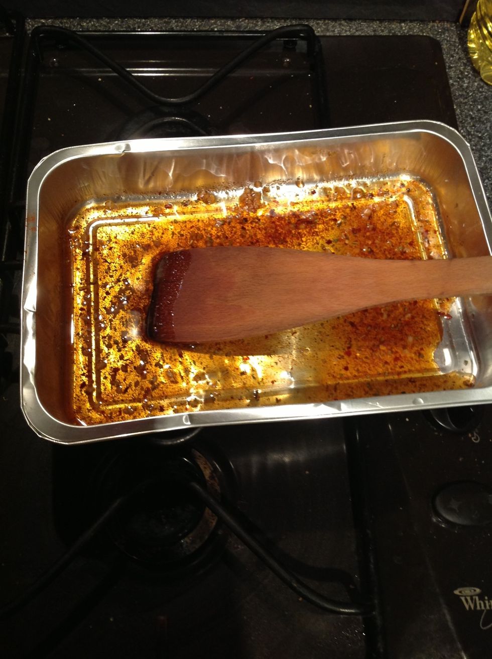 Place the paprika, salt, pepper, garlic mixed herbs, chilli flakes and oil into a roasting tray; and mix