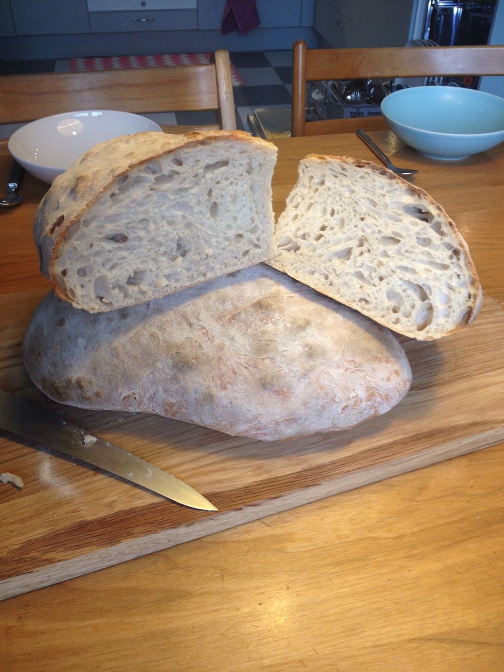 Turn the oven down to 250 degrees and in with the bread! Throw 2-3 icecubes at the bottom of the oven. After 10 minutes, turn the oven down to 200 degrees.