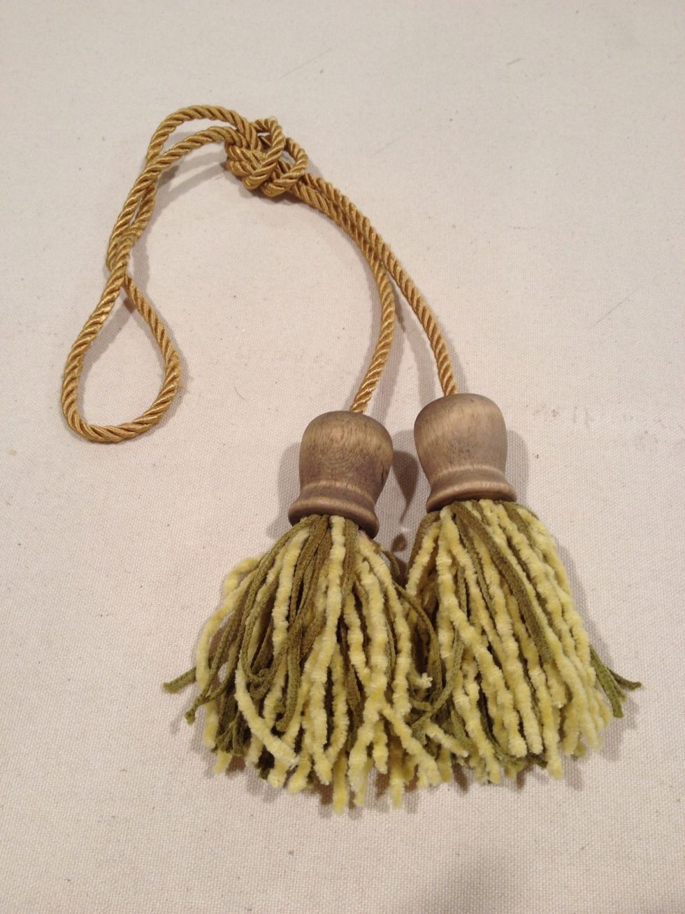 Thread two of the wooden tassel forms onto the twist cord as shown. Slide the forms to each end of the twist cord being careful not to allow them to slip off. .