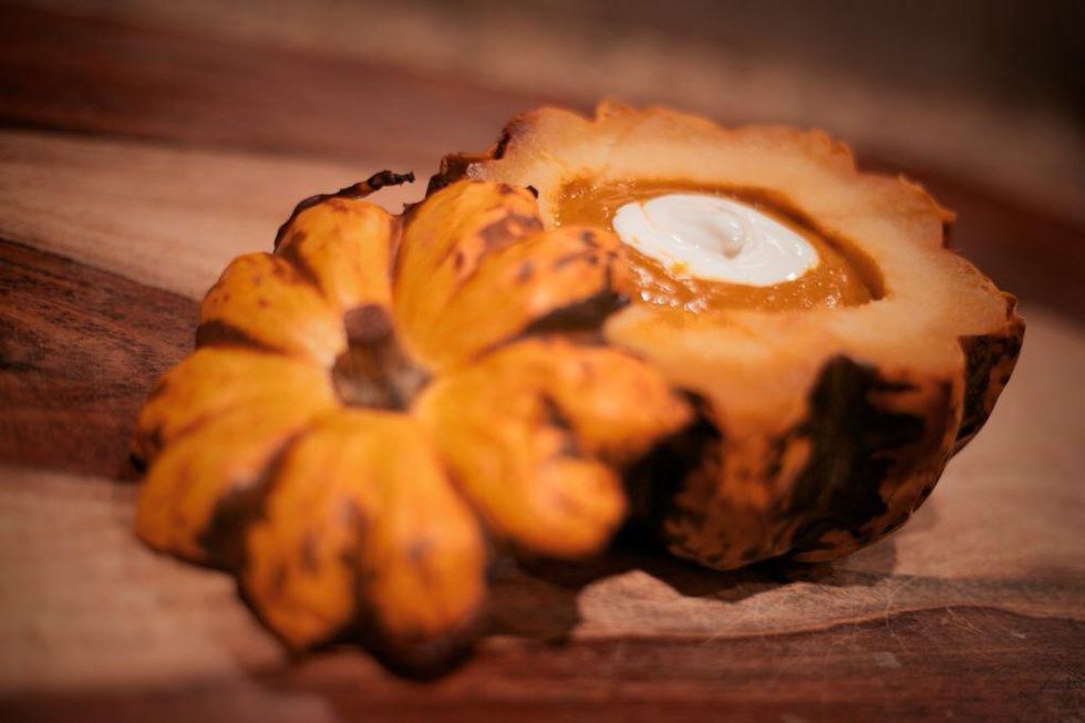 Mix goat cheese, thyme, and almond milk and spoon topping on the pumpkin soup. To make bowl, cut top off and de-seed pumpkin. Cook for 45 minutes at 400 degrees. Serve, show, and enjoy!!!