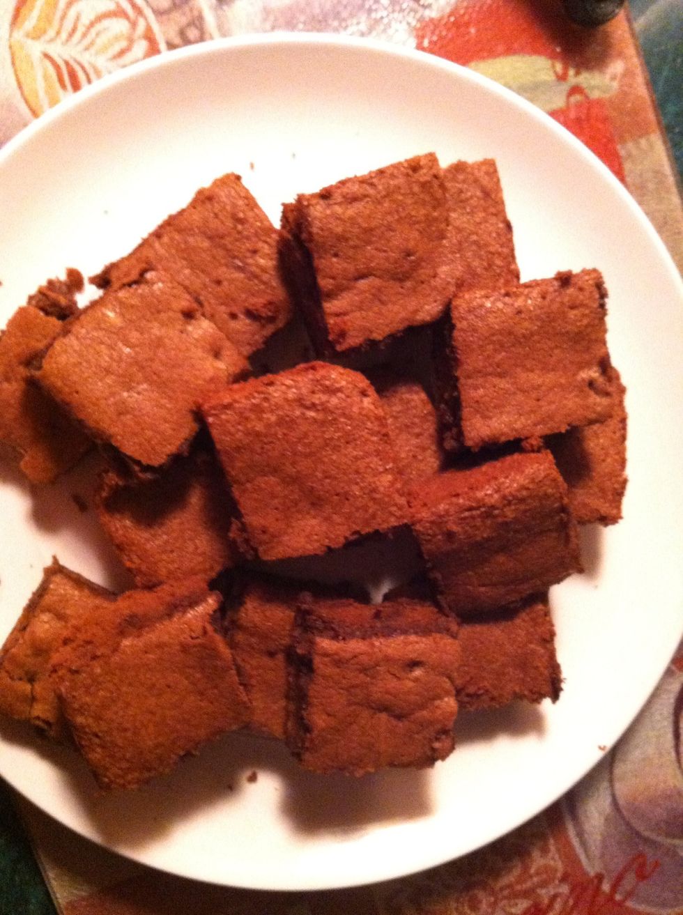 Pour your batter into an 8x8 (9x9 for thinner) pan. (Note: I added about 1/2 Cup of semi-sweet choc chips to the batter because I had them in the kitchen and wanted a little extra chocolate kick 😉)
