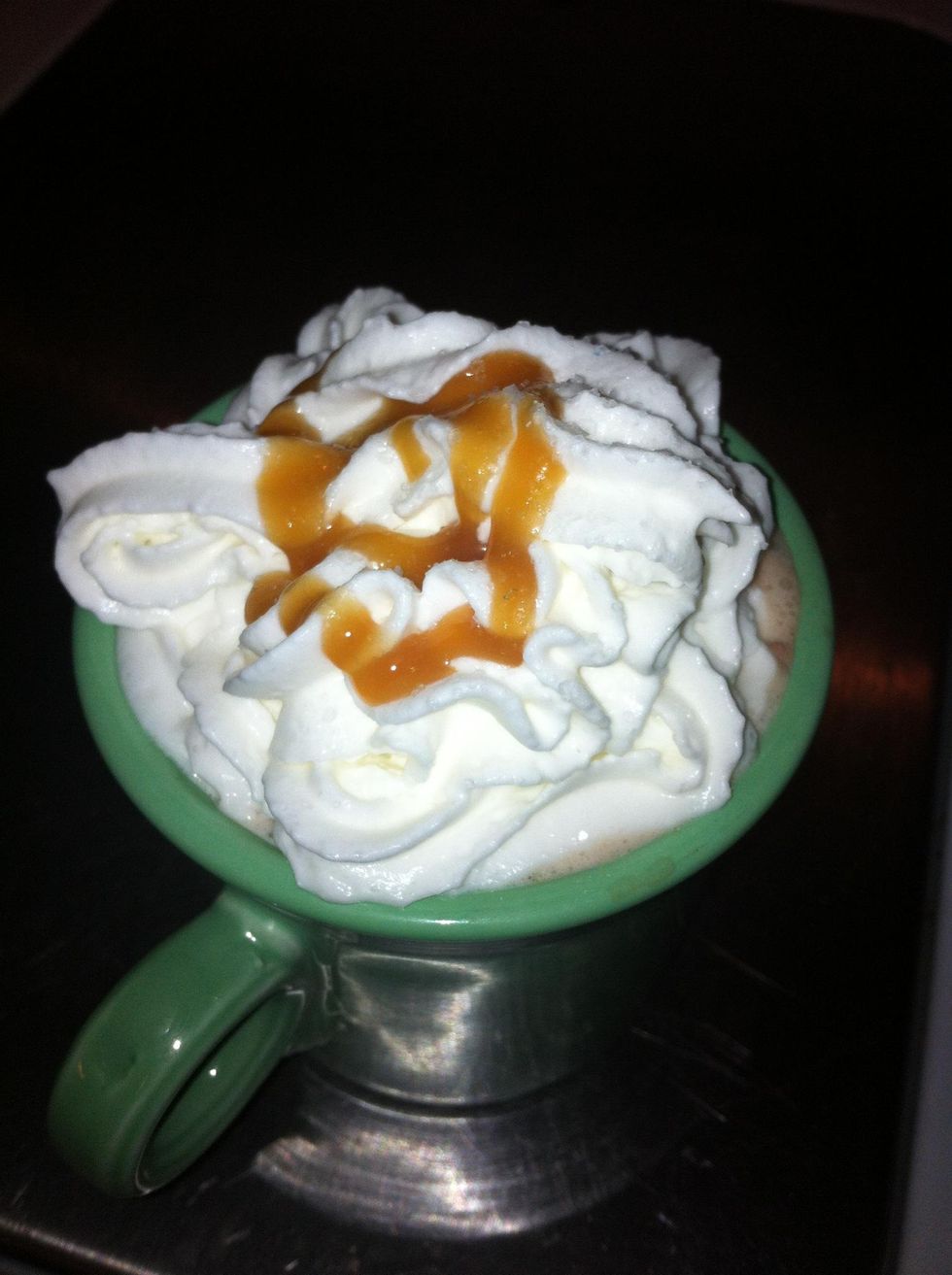 Get all the ingredients!8 oz or milk in saucepan.Add 3 spoonfuls of ovaltinePut caramel at bottem of mug.Toppings: whipped cream, drizzled caramel sauce, and crushed sea salt.