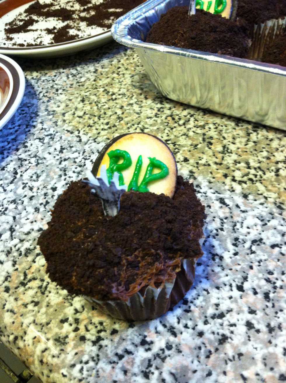 Next, take any icing (either store bought like mine I your own mixture through a piping bag) and carefully write "RIP" on each halves.