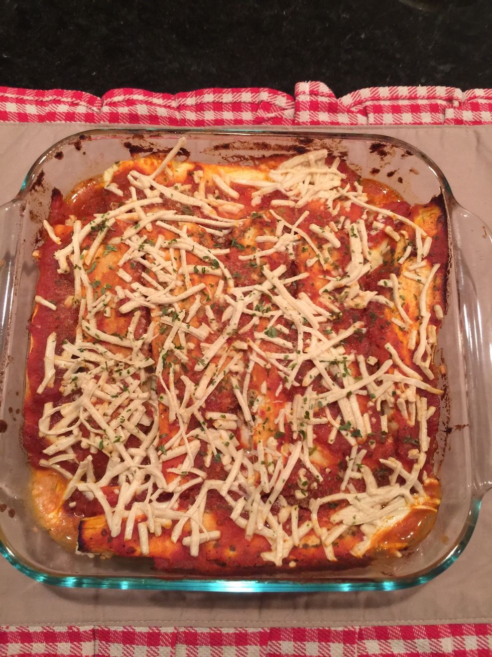 On top of the pasta sauce add your zucchini spears then layer on top of them vegan ricotta. Sprinkle onion garlic lack pepper powder mix.