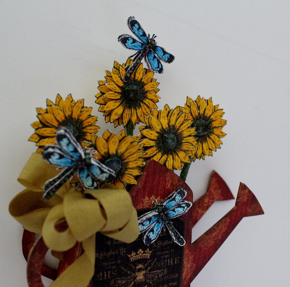 Cut Water Can out from chipboard and Sizzix Die...cover with French Country Paper. Add Sunflowers and Dragonflies to Can. Add a pretty bow. Place watering can on beads.