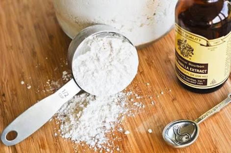 Tap edge of measuring cup, then scrape remaining flour off with a knife.