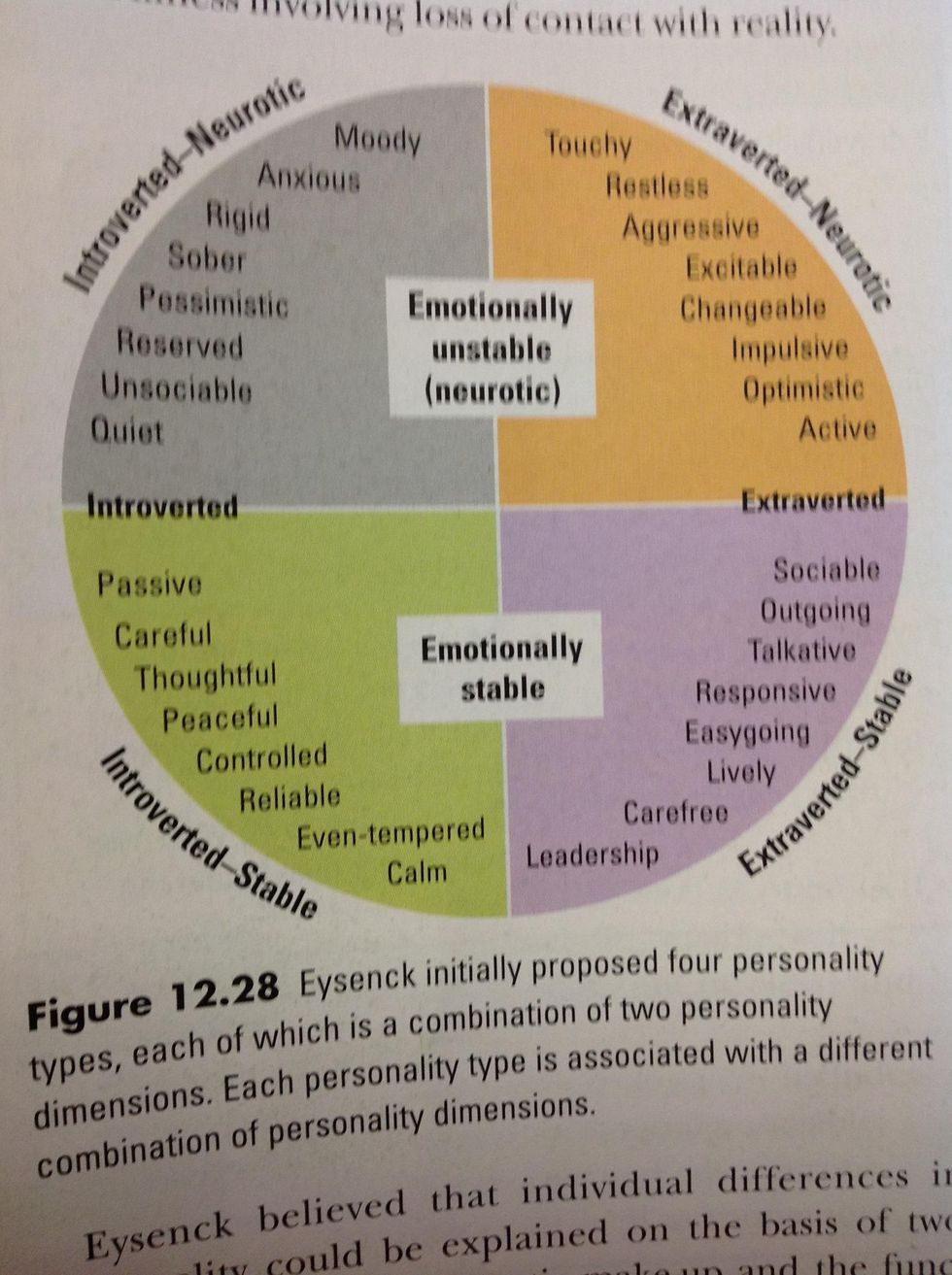 Hans Eysenck (1916-97)Eysenck defined the "Dimensions of Personality" 1. Introversion -Extraversion 2.Neuroticism - Emotional stability People can be identified into 4 different personality typesEysenck's Personality Types
