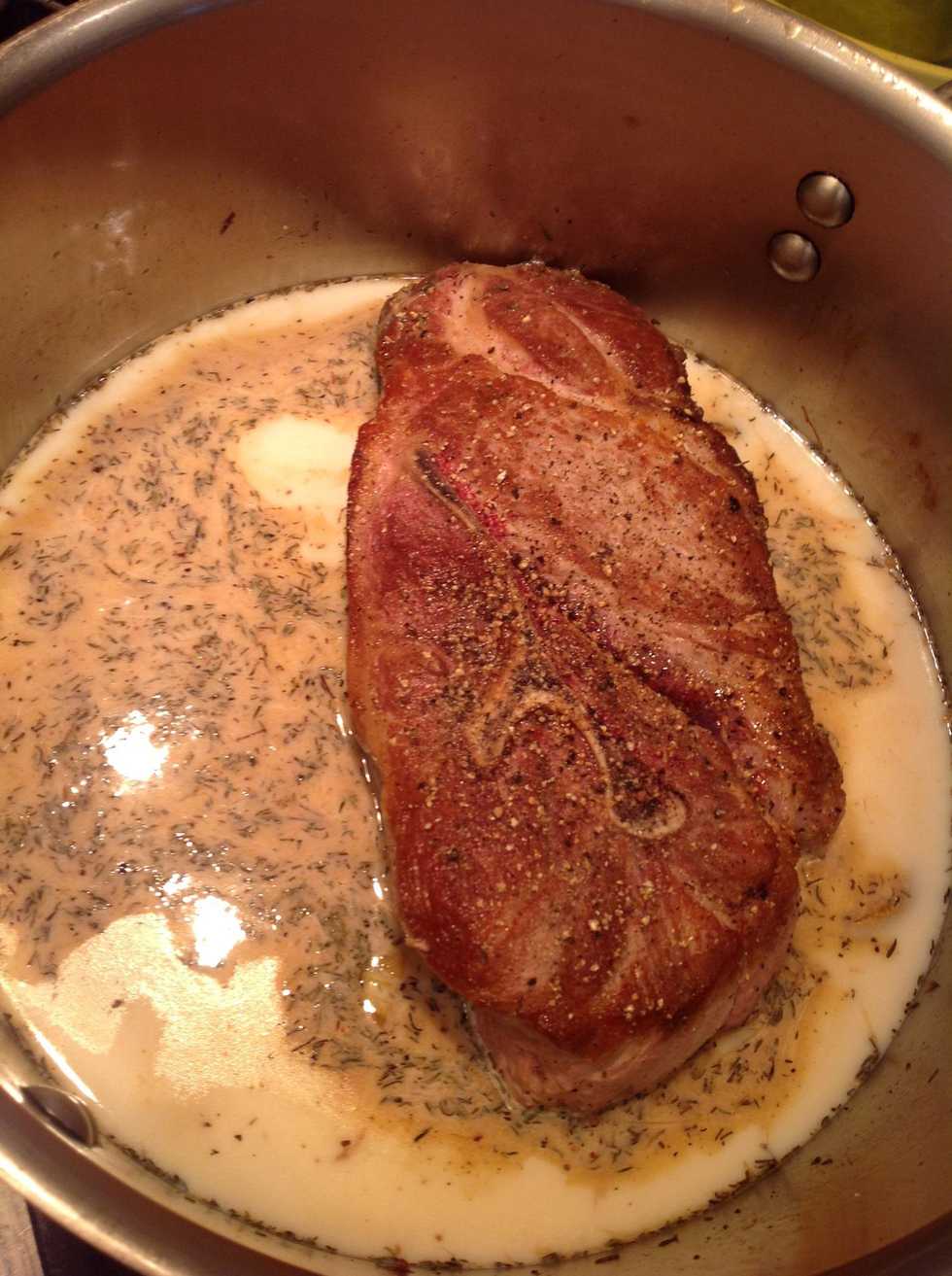 When wine is reduced add stock, thyme and milk