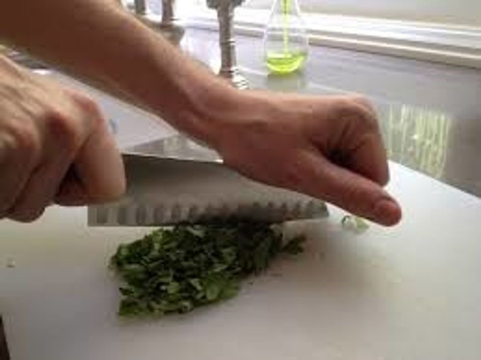 Now gather all the slivers together into a circular shape. Place the hand you are not cutting with on top of the knife.