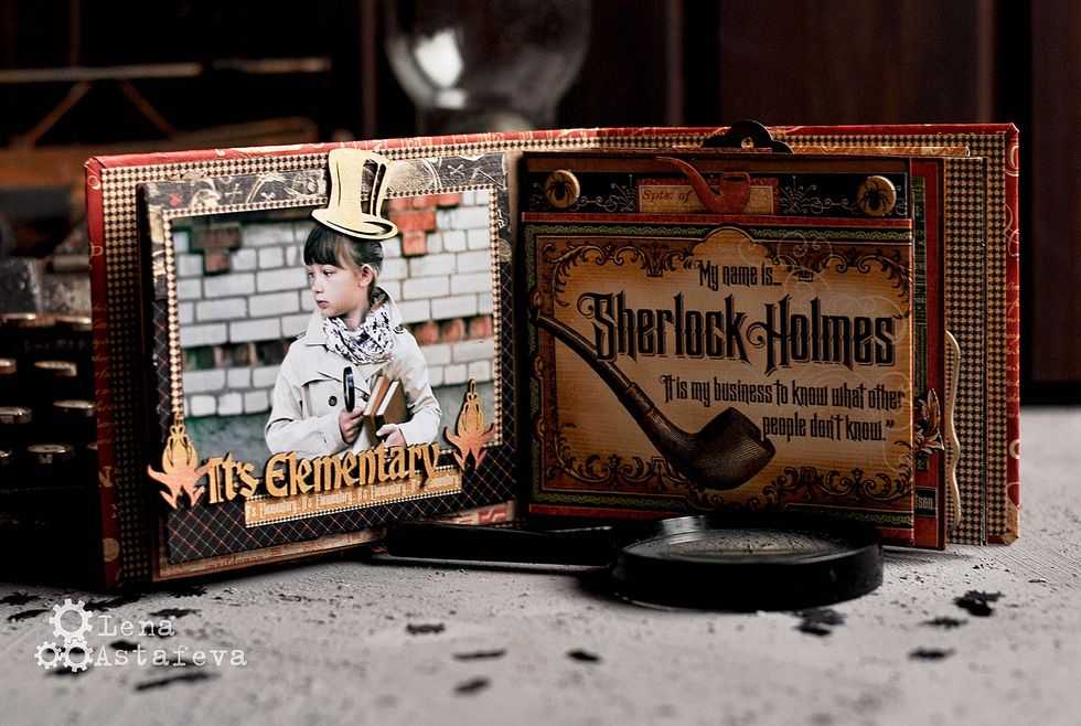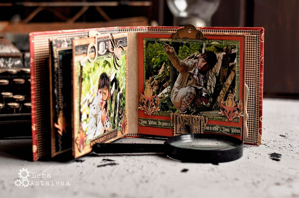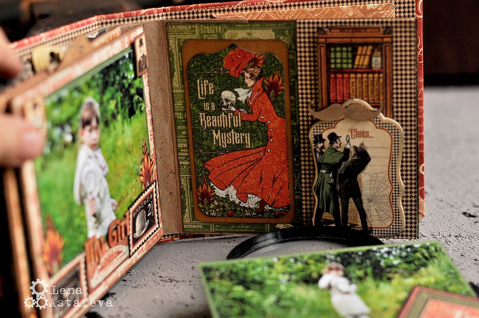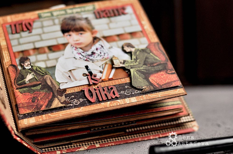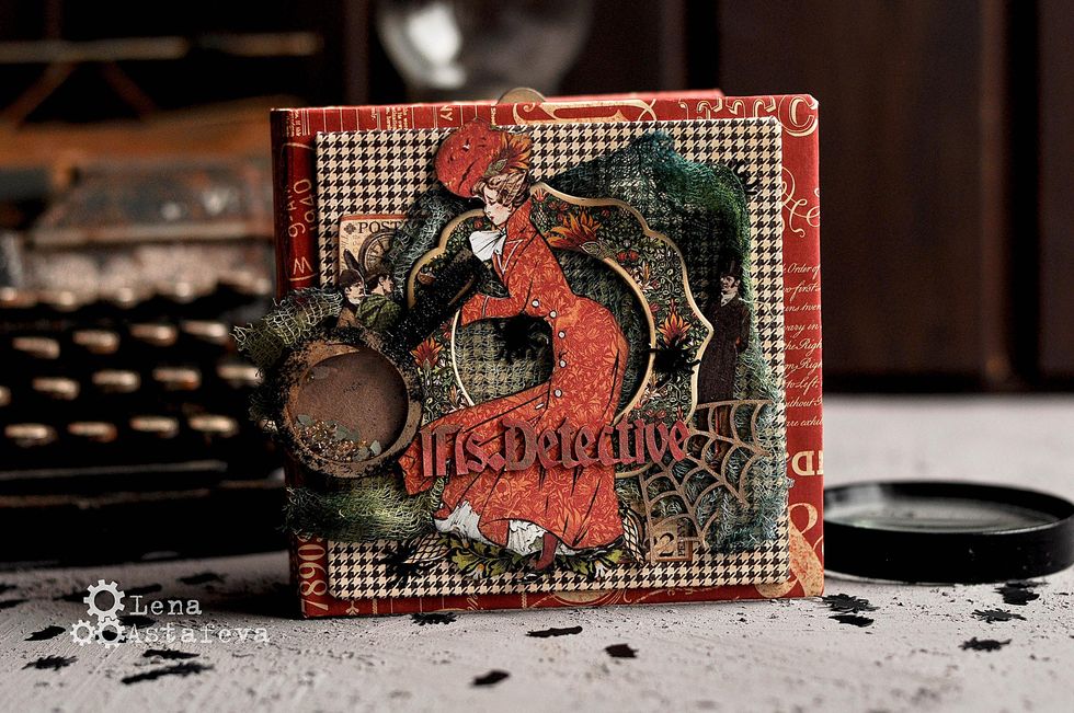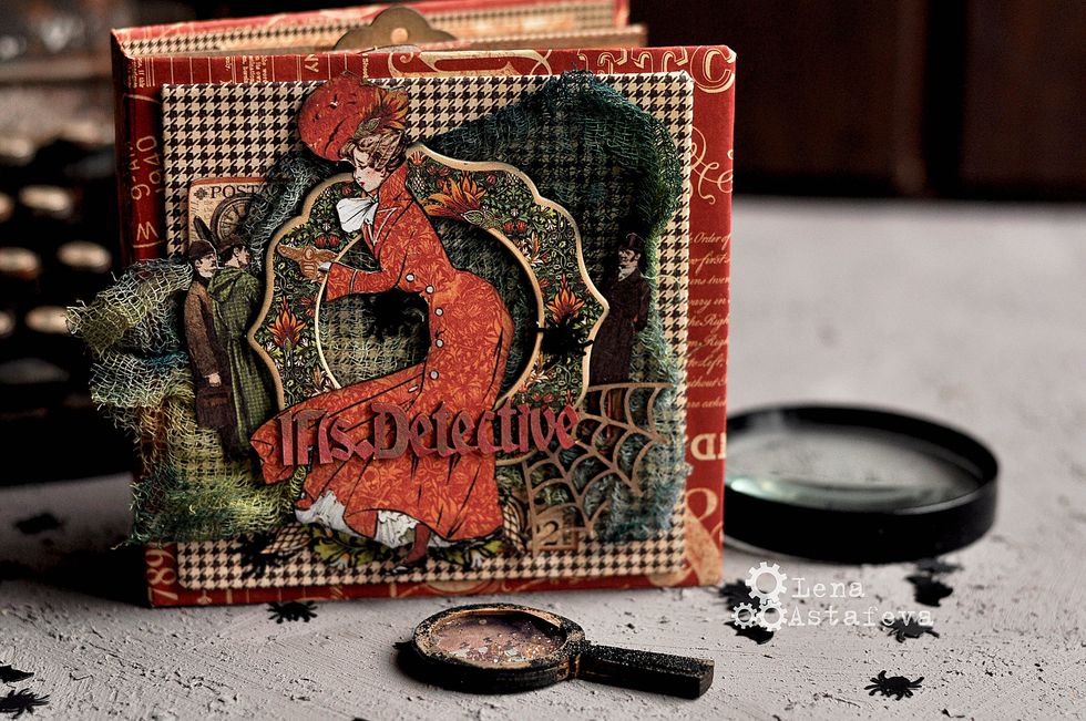 оформление обложки просто-дополнительный лист фоновый, наклеен на картон, на него бинт, покрашенный спреями,рамочка Graphic 45, вырезанные фигурки героев, шейкер на магните и надпись чипборд