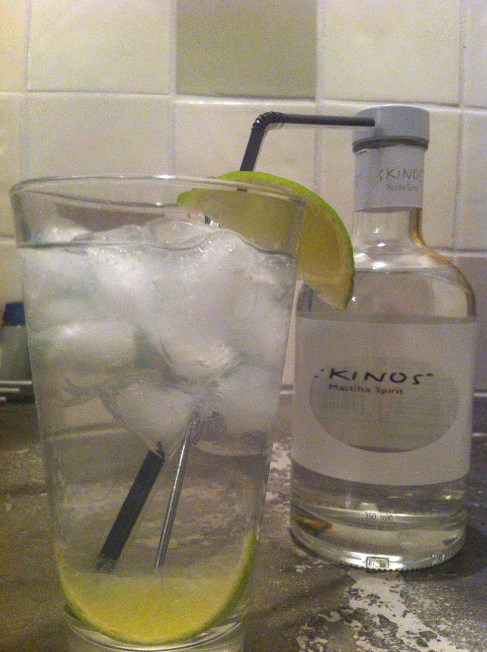 Take a tall drink glass and fill with ice cubesAdd 4-5 centiliters of Skinos MastihaFill up with tonic waterStir and garnish with a slice of lime. Enjoy!