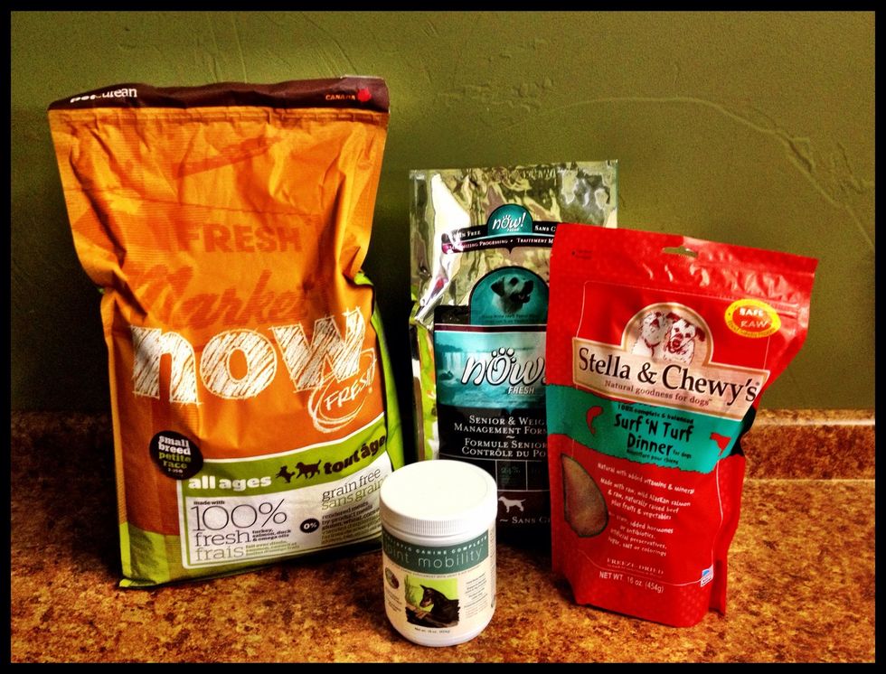 Kibble: Petcurean "Now Small Breed" mixed 50/50 with "Now Senior/Weight Management" Freeze dried: Stella & Chewy's "Surf n Turf" dinner Supplement: Joint Mobility by Wholistic Pet Organics