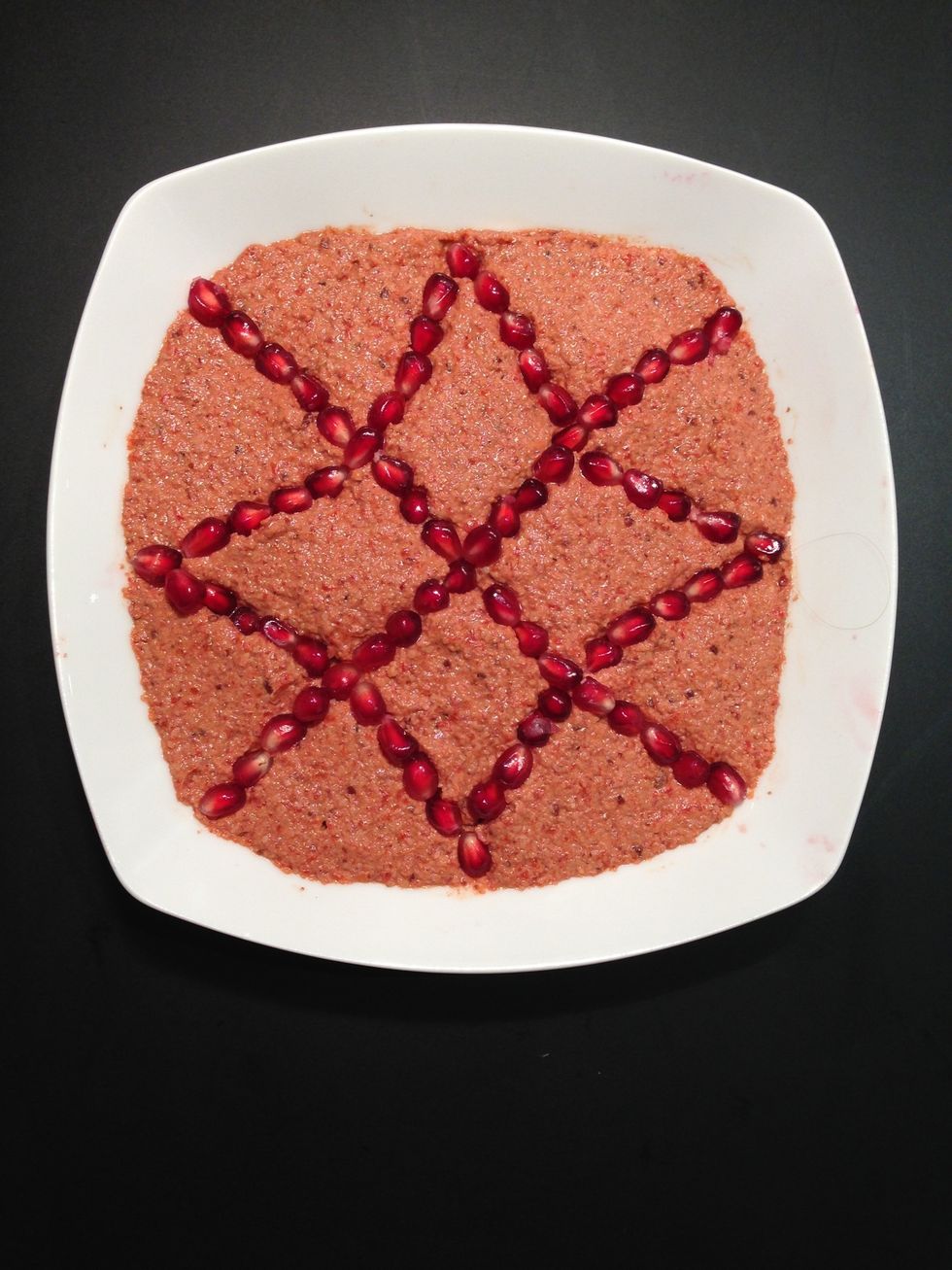 If you like to eat spicy then add 2-3 pepperoncini on the food processor. Add the fresh pomegranate on the top.